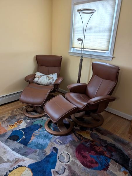 Fjords Recliners; Floor Lamp; Area Rug. Pair of light brown leather Fjords recliners, ea. 32"Wx26"Dx39"H with foot rests, ea. 21"Wx15"H; nickel floor lamp, 6'H; New Wave area rug, approx. 5'x8' (req cleaning); giraffe pillow. Loc on 2nd floor.
