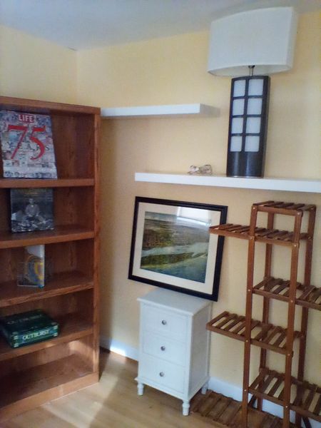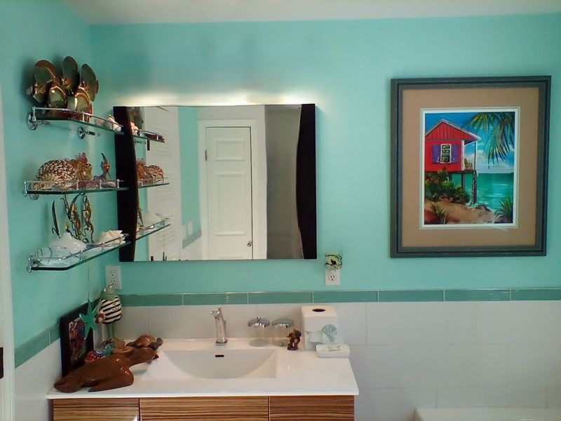 Beach Décor, Wall Art. Signed Sharon wood painted frame with triple-matting, beach-motif wall art, behind glass, 28"Wx32"H; décor incl: turtles (see photo); glass fish; shells; whimsical décor; bath ensemble. Shelving not incl. Loc in 2nd floor bath (top of stairs).