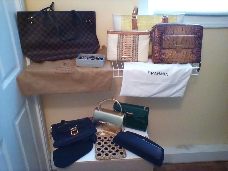 Designer Handbags, featuring Louis Vuitton, Brahmin. Louis Vuitton tote (has surface scratches) with matching wallet; three Brahmin handbags with one wallet; JPK of Pariscross-body bag; three vintage clutches & one coin purse; three others, including gilt beaded bag and green handbag by Block. Located on the second floor in walk-in closet (left wall).