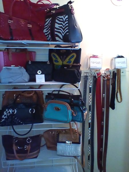 Designer Handbags and Belts, featuring Kate Spade, Brahmin, Peruzzi. Fifteen handbags incl: Kate Spade; Brahmin; Peruzzi; two vintage beaded clutches; brown striped bag from Spain; red tote by LaCoste; black zebra print by Stacey Whitmore; two Next belts (pink, black); eight other assort belts (see photos for details); Loc on 2nd floor in walk-in closet (right wall).