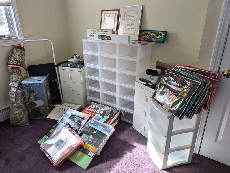 Household Functional, featuring Shoe Storage. Eighteen stacking shoe storage containers, overall 34"Wx14"Dx42"H; fringed area rug, approx 3'W (length not known); folding step ladder; pair of three-drawer white nightstands (matches furniture in lots 40, 41, 49); three-drawer white plastic storage; (four) fringed blankets; whimsical toilet paper holder (boxed); assorted wall decor; electronics (radios, etc); Nikon binoculars in case; other related items as seen in photos. Located on the second floor.