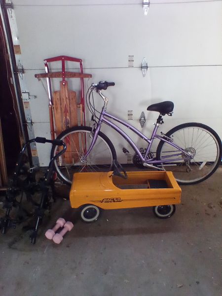 Vintage Sporting, featuring Flexible Flyer III. Vintage flexible flyer sled; Racer yellow metal child's car; Cambridge Fuji 21-speed bike; Yakima bike rack. Located in the garage.