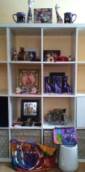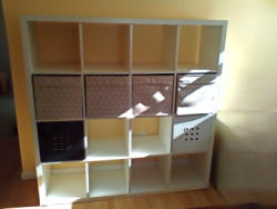 Cubby Storage. White 16 cubby unit, 58"sq x15"D with four fabric and two acrylic storage container (2 new); white shoe storage. Loc on 2nd floor. May req partial dismantling to remove, bring tools.