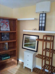 Furniture and Art. Wood bookcase, 30"Wx1'Dx6'H with two adjustable & two static shelves; plant stand approx. 28"Wx10"Dx52'H; white three-dr cab, 16"Wx1'Dx26"H; modern table lamp, 31"H with fabric boat-shaped shade; framed & matted, wall art of No. Palm Beach behind glass, 27.5"Wx2'H. Loc on 2nd floor.