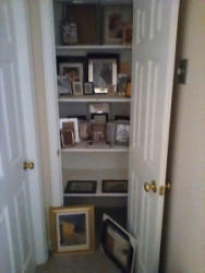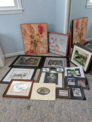 Frames and Signed Wall Art. Over 2-doz frames (assort sizes); two pcs signed Morley wall art in wood frames, double-matted, behind glass. See photos for details. Loc on 2nd floor in closet.