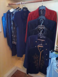 Designer Clothing and Jackets. Sixteen pieces: blue cocktail dress with bolero jacket (likely size 12); Ronni Nicole (unworn) dress, size 12P; T&W Designs sheer blue & black dress, size L; Papell Boutique silk & beaded jacket, size PL; Cass blue suede dress jacket, size L; Brooks Brothers navy blue with gilt trim jacket, size 12; orange suede jacket, size 14; two Lilly Pulitzer dresses, size L & 14 (req cleaning); black wool sweater with gilt trim, size M; Geoffrey Beene black knit jacket, size 12; two colorful Gretchen Scott 2-pc work-out sets, size S; Amanda Charles faux fur short dress jacket, size L; Saga Fox white fur jacket, size S (monogrammed, 50/50 acetate, Bemberg - see photos). Located on the second floor in walk-in closet (back).