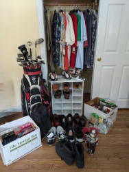 Golf Apparel, Clubs, Balls. Clothing, shoes, gloves (see photos for tags, sizes, quantity); golf clubs in bag; white shoe cubbie; several boxes of golf balls; other related item as seen in photos. Located on the second floor.