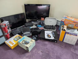 Electronics, featuring Samsung, Panasonic, LG. 33" LG TV with remote; Samsung TV with remote (was mounted, no stand); Panasonic DVD recorder with remote & manual; APC battery back-up; other related items as seen in photos, including several wireless headphones (boxed). Located on the second floor.