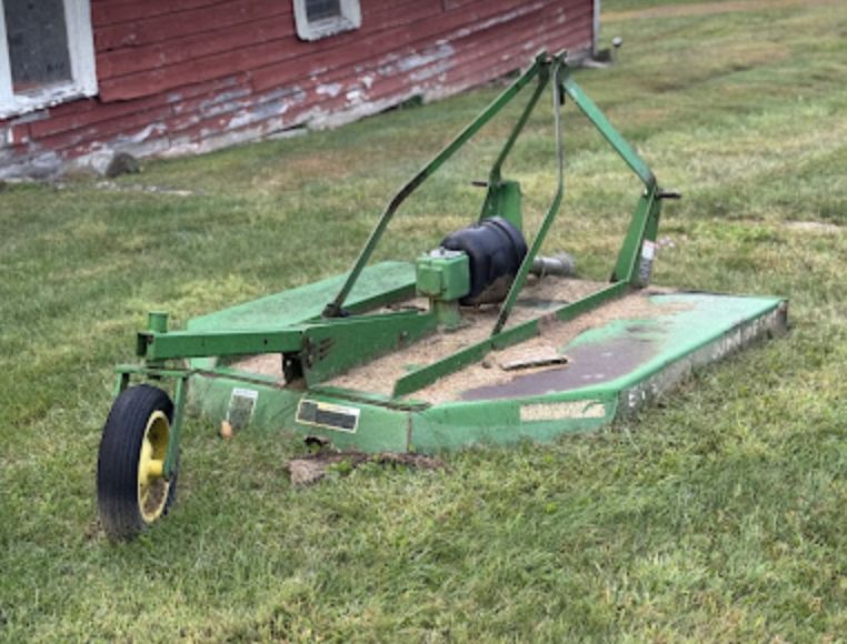 John Deere rotary cutter, three point hitch type, with PTO shaft, gearbox, and rear tail wheel assembly. Photographed both prior to winter storage and as currently located. No model or serial number observed. Stored outdoors. Snow will be cleared to machine prior to pickup. No equipment is onsite to assist loading. Bring the proper tools, equipment, and help needed to load your items.
