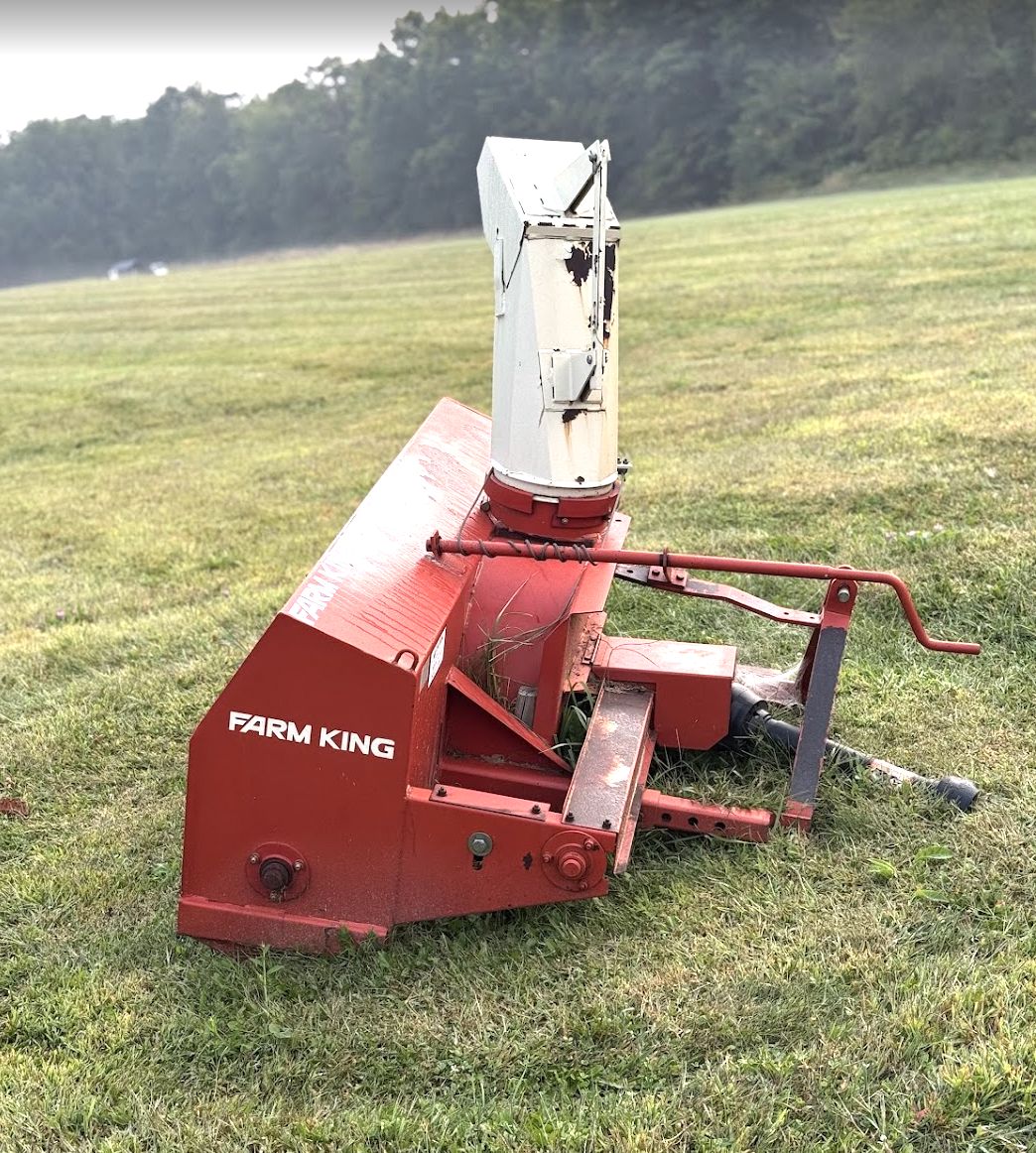 Farm King three point snowblower attachment, PTO driven, with adjustable discharge chute and manual rotation control, shown stored outdoors and partially covered in snow. Auger and housing visible. Exact model and working condition unknown. Snow will be cleared to machine prior to pickup. No equipment is onsite to assist loading. Bring the proper tools, equipment, and help needed to load your items.
