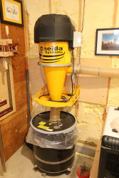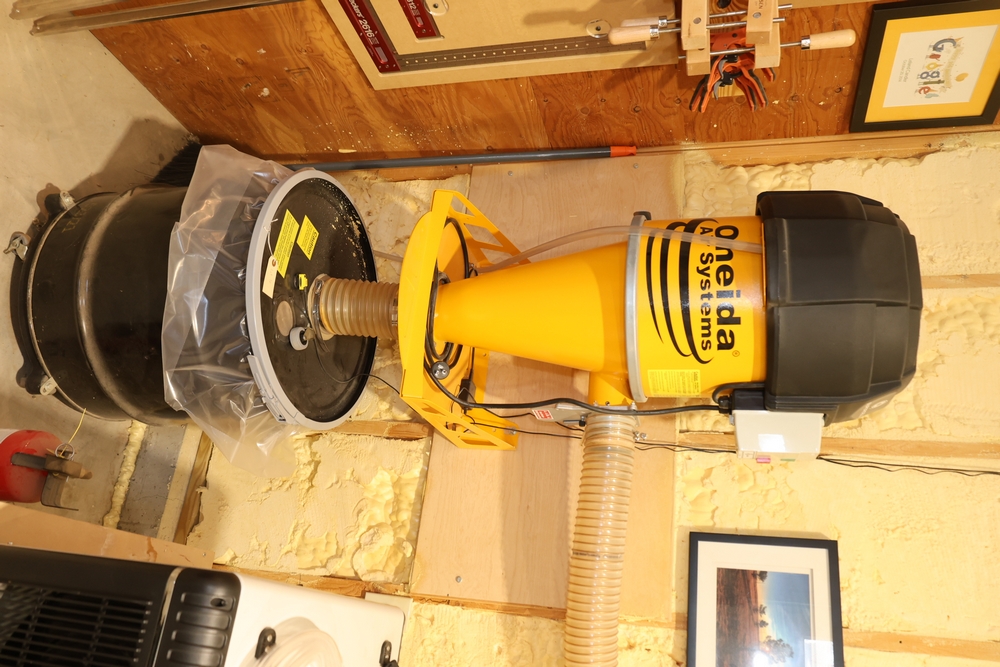 Oneida Air Systems dust collection unit with wall-mounted cyclone, collection drum, connected rigid metal ducting, flexible hose sections, blast gates, clamps, and assorted fittings, along with additional loose duct components and accessories stored in plastic bins, as shown. Buyer is responsible for the proper and safe removal to the first disconnect. Buyer must take all. Does not include parts integral to other machines. No equipment is onsite to assist loading. Bring the proper tools, equipment, and help needed to load your items. Seller reports: nearly all the powertool (especially Festools) are in fantastic condition, low low use and have been kept in climate controlled garage.