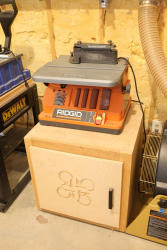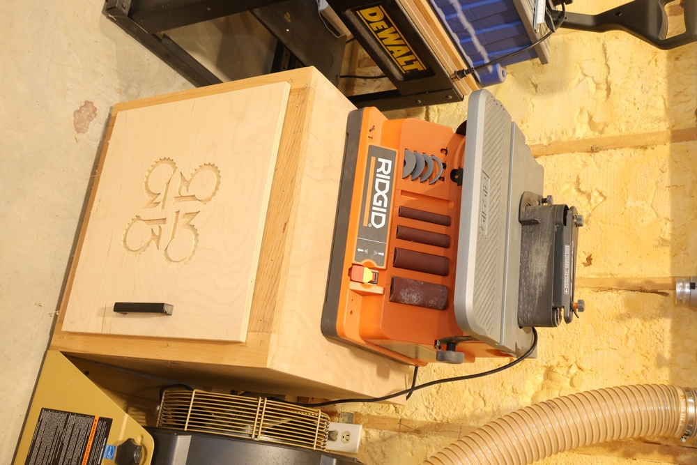 Ridgid oscillating spindle sander, model EB4424, mounted on a benchtop surface, with sanding drums, sleeves, and table inserts stored in the cabinet below, along with a MicroJig container stored in the same cabinet. Buyer is responsible for removal to the first disconnect. Excludes dust collection ductwork. No equipment is onsite to assist loading. Bring the proper tools, equipment, and help needed to load your items. Seller reports: nearly all the powertool (especially Festools) are in fantastic condition, low low use and have been kept in climate controlled garage.