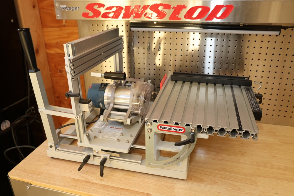 PantoRouter woodworking machine by WoodCraft Solutions LLC, equipped with a Bosch 1617EVS router motor, adjustable pantograph mechanism, aluminum work table, and clear safety guard, mounted on a benchtop base with the PantoRouter table assembly and controls. No equipment is onsite to assist loading. Bring the proper tools, equipment, and help needed to load your items. Seller reports: nearly all the powertool (especially Festools) are in fantastic condition, low low use and have been kept in climate controlled garage.