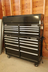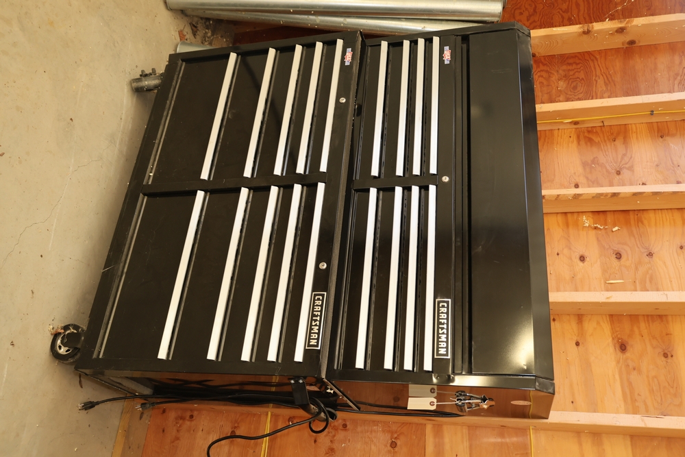 A Craftsman steel tool cabinet approximately 52 inches wide with a hinged top compartment and multiple drawers, containing a mixed assortment of shop tools, hardware, and accessories. Contents include a Ramset MasterShot powder-actuated fastening tool in packaging, a corded electric drill, Kreg drawer slide jigs, Kreg pocket-hole screws and hardware, Cable Boss fasteners, assorted electrical switches and connectors, measuring and layout tools, clamps, markers, drill bits, fasteners, manuals, and various boxed and loose shop supplies distributed throughout the drawers and top compartment. No equipment is onsite to assist loading. Bring the proper tools, equipment, and help needed to load your items.