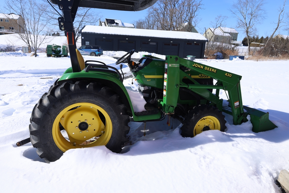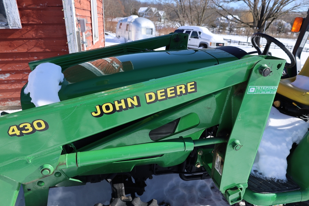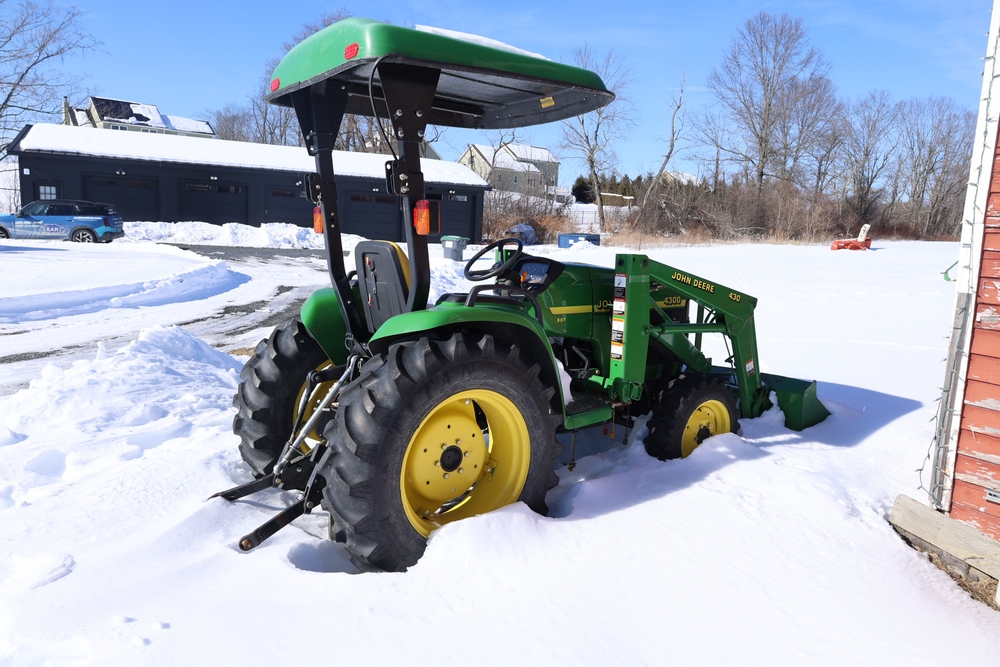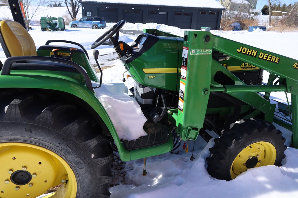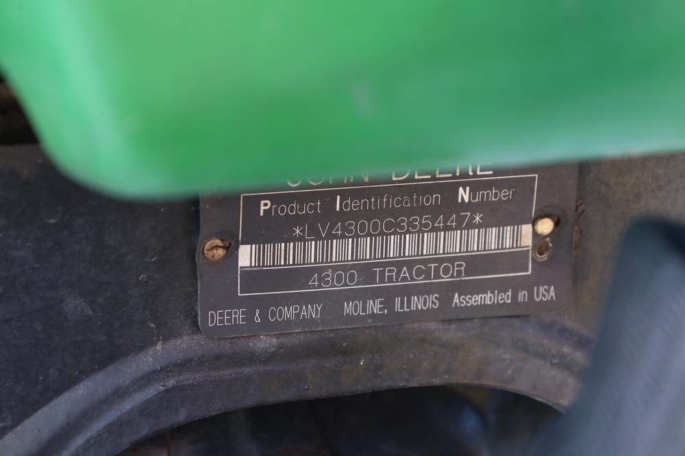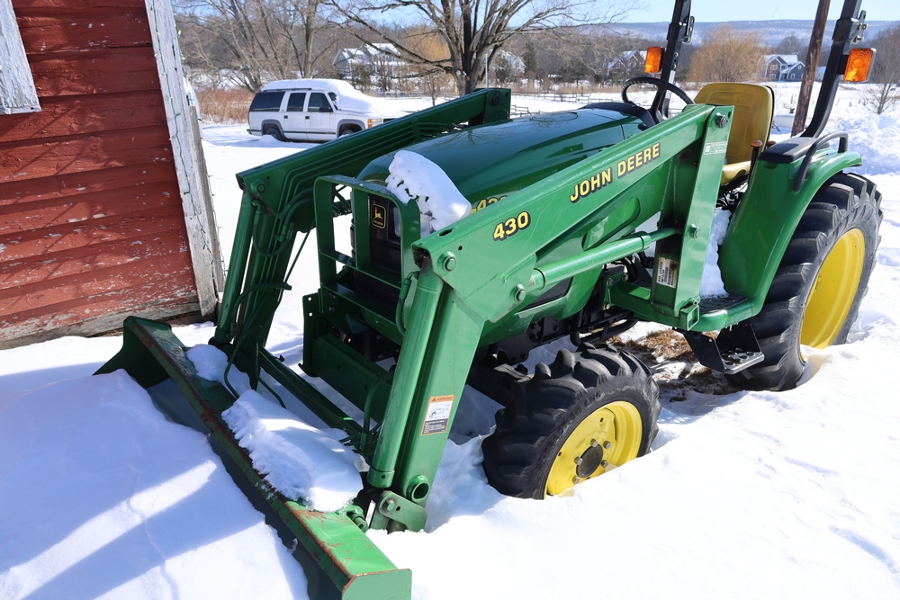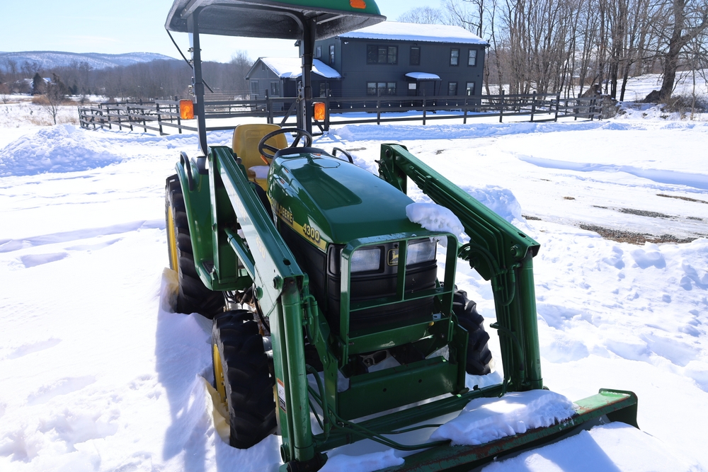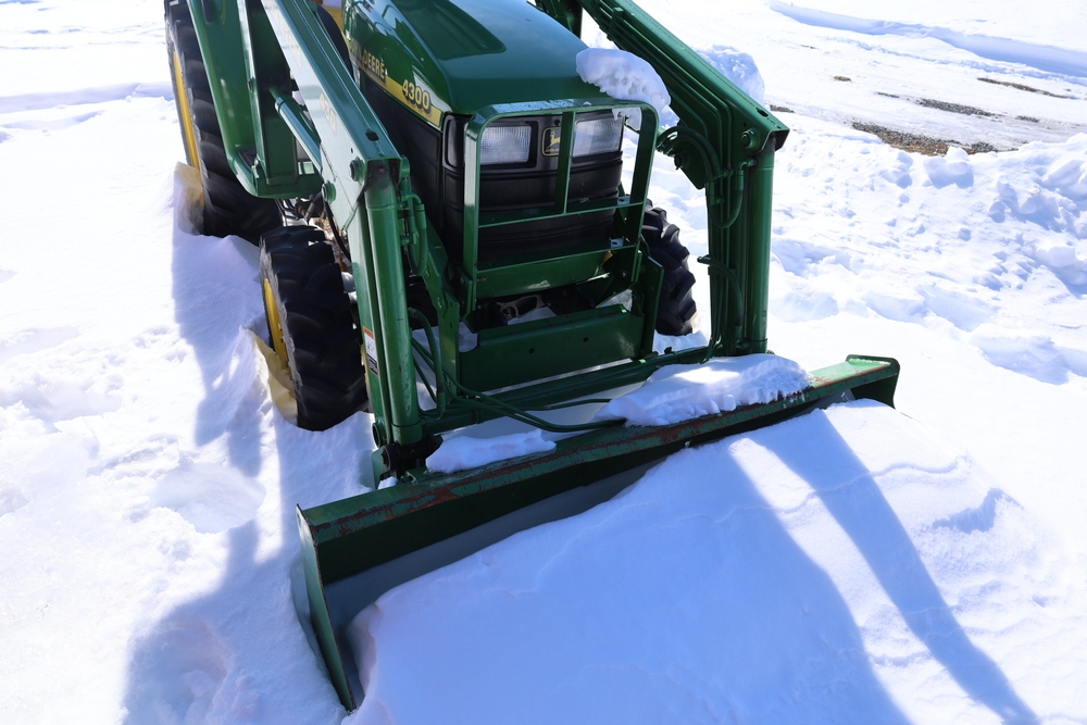 John Deere 4300 tractor equipped with a John Deere 430 front loader. Product Identification Number LV4300C335447. Hour meter displays 526.2 hours at time of photography. Open operator station with rollover protection structure and canopy. Three-point rear hitch present. Seller reports ran when parked, dead battery, high gear needs repair. Key available. Snow will be cleared to machine prior to pickup. No equipment is onsite to assist loading. Bring the proper tools, equipment, and help needed to load your items. No equipment is onsite to assist loading.