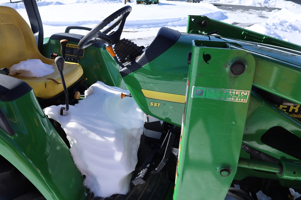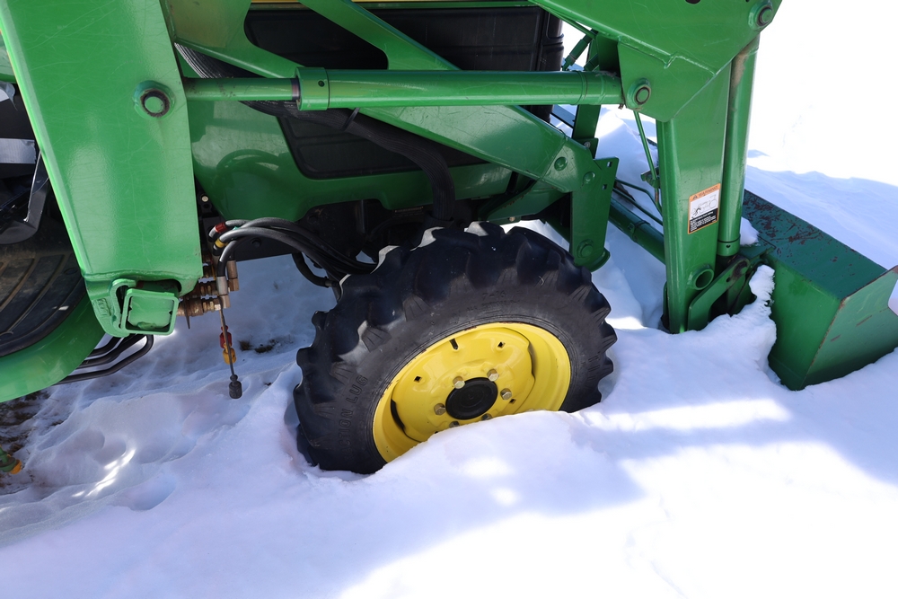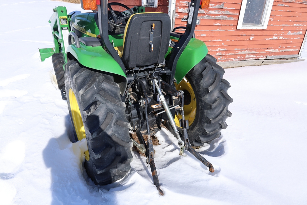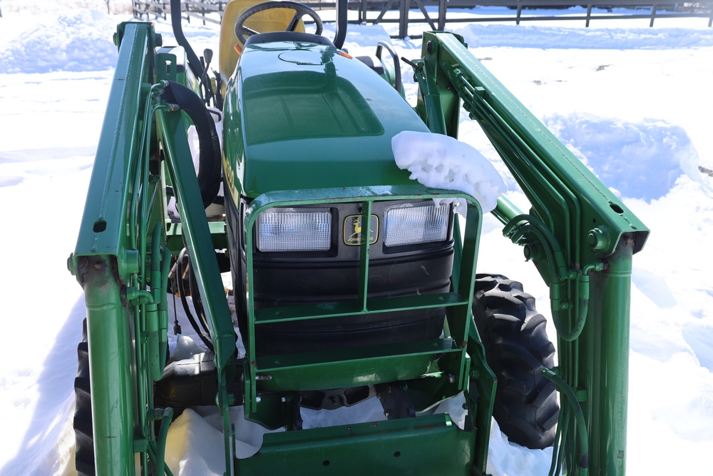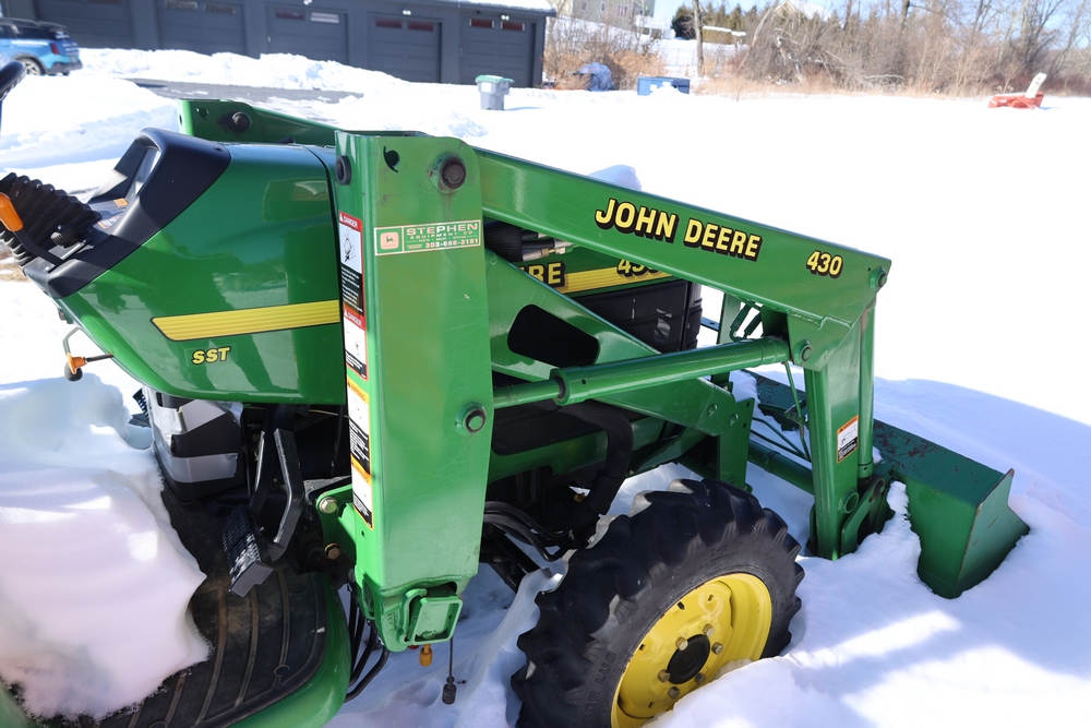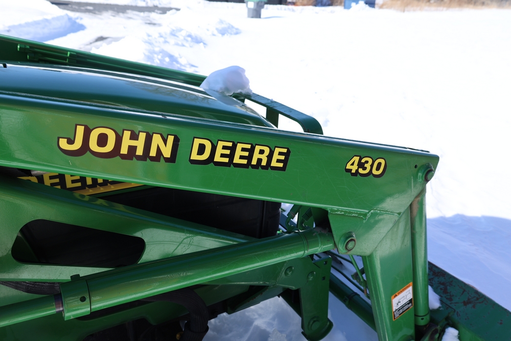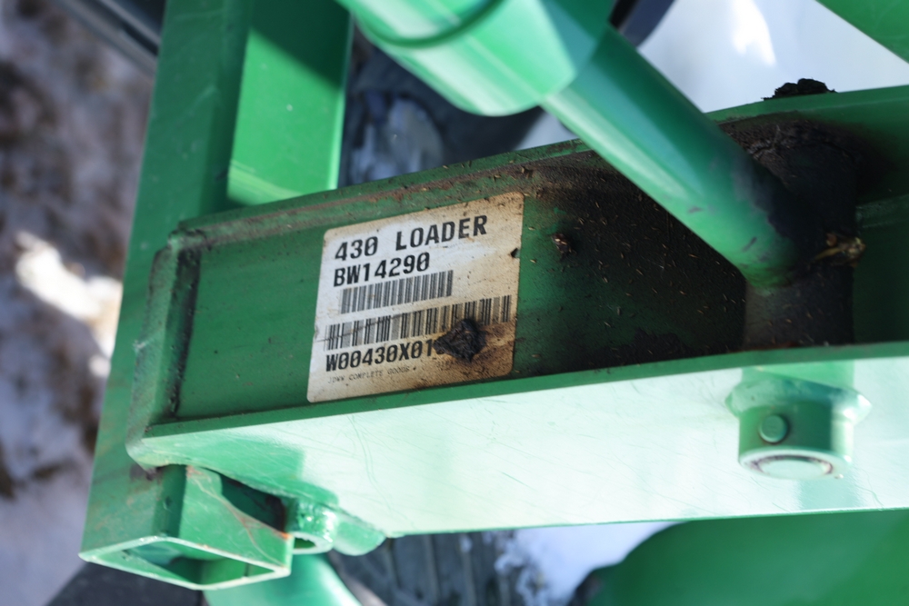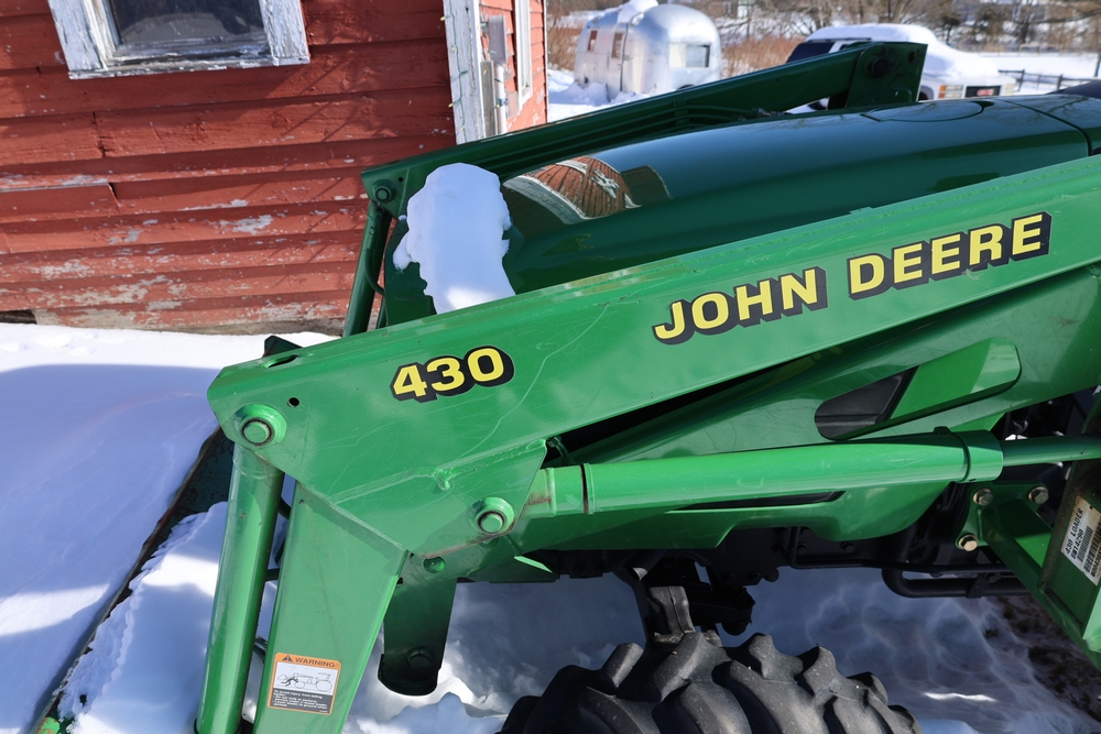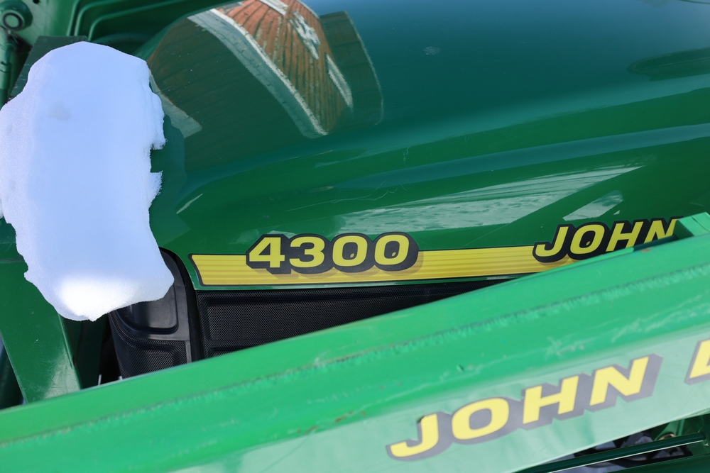 John Deere 4300 tractor equipped with a John Deere 430 front loader. Product Identification Number LV4300C335447. Hour meter displays 526.2 hours at time of photography. Open operator station with rollover protection structure and canopy. Three-point rear hitch present. Seller reports ran when parked, dead battery, high gear needs repair. Key available. Snow will be cleared to machine prior to pickup. No equipment is onsite to assist loading. Bring the proper tools, equipment, and help needed to load your items. No equipment is onsite to assist loading.