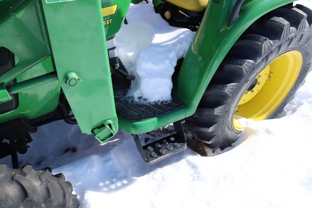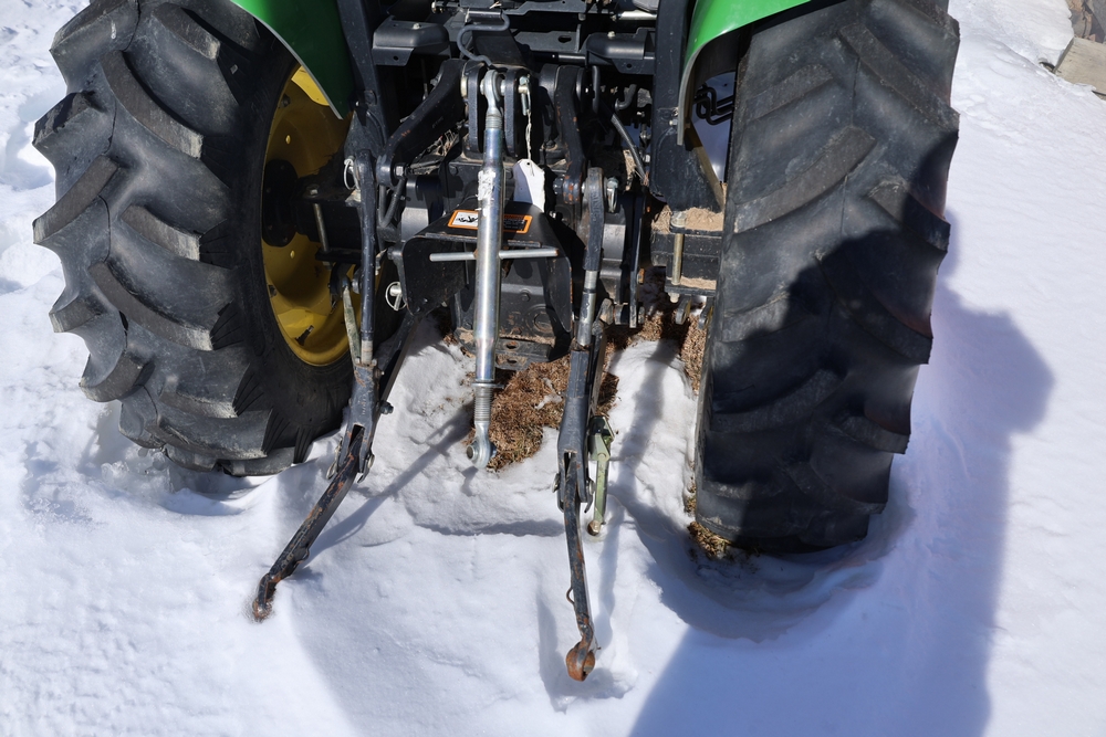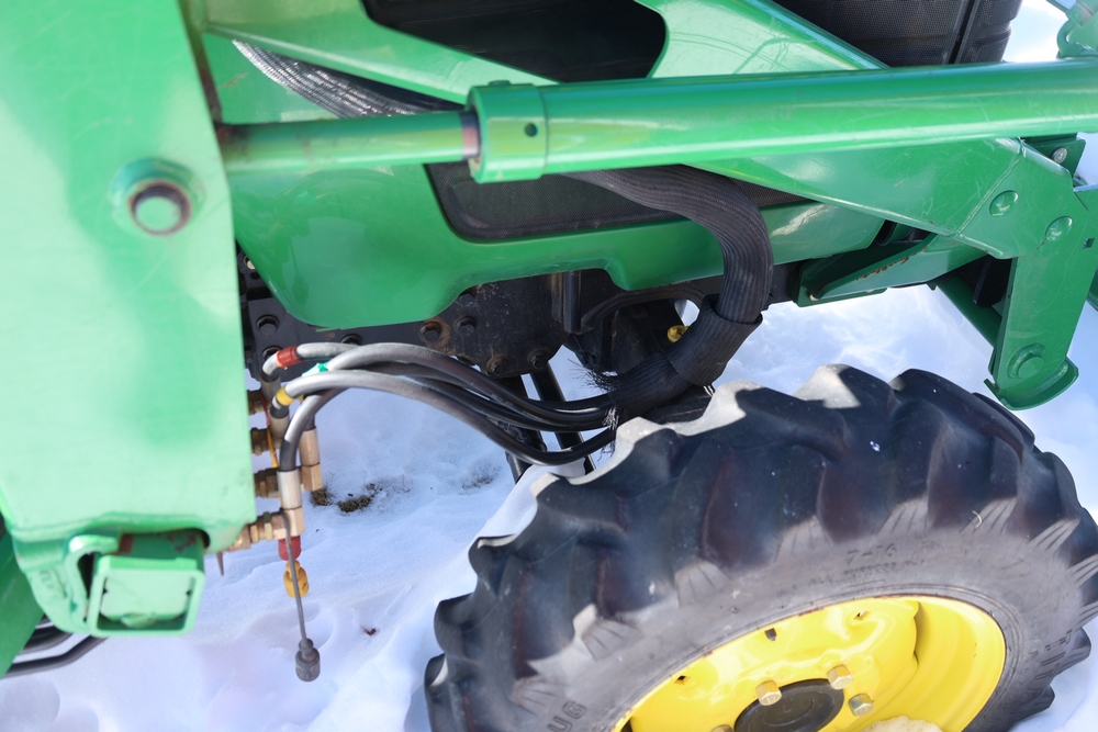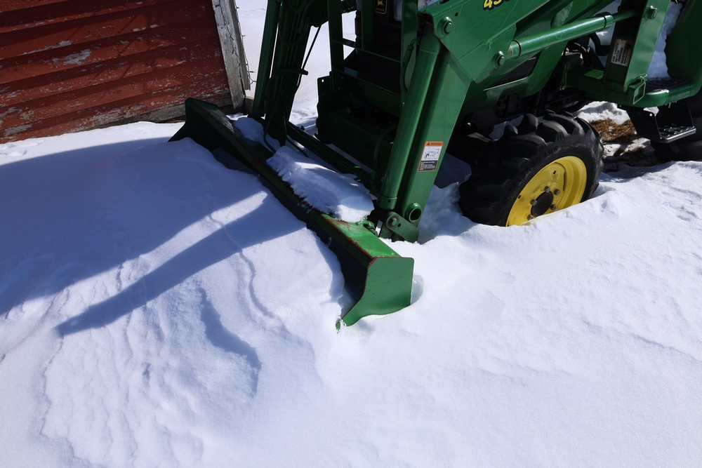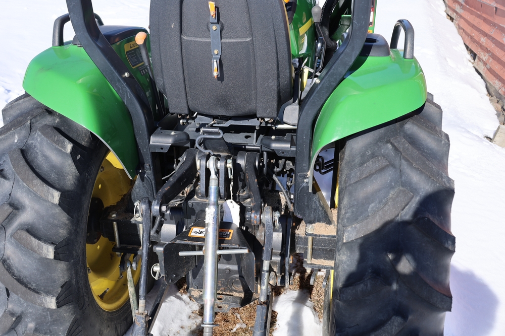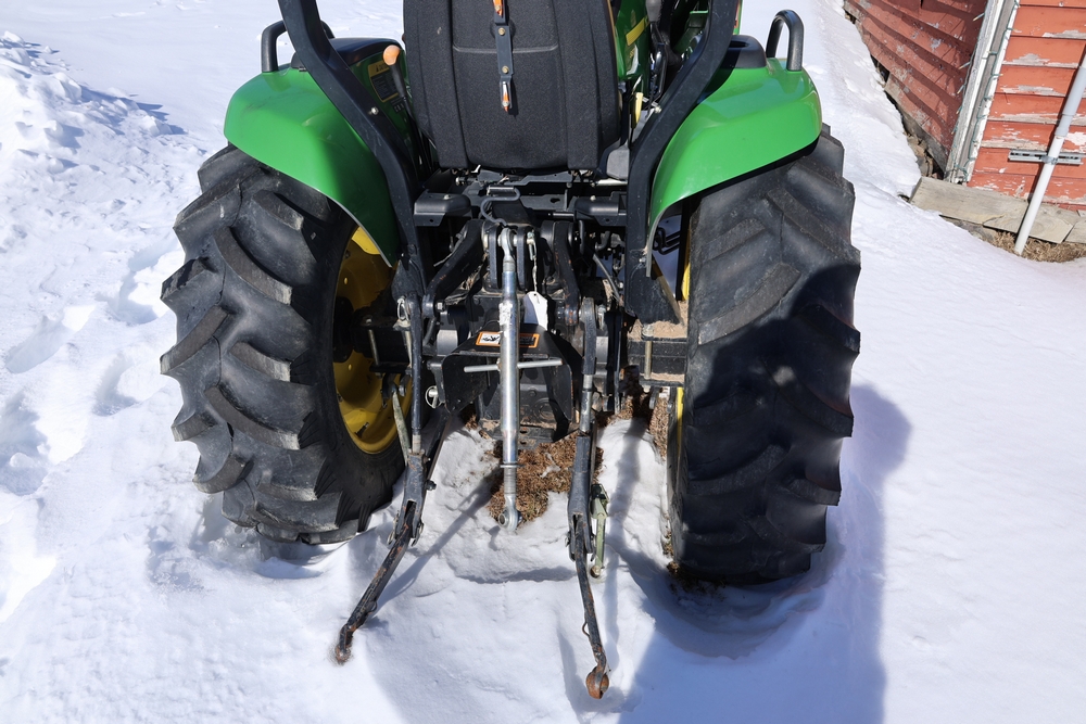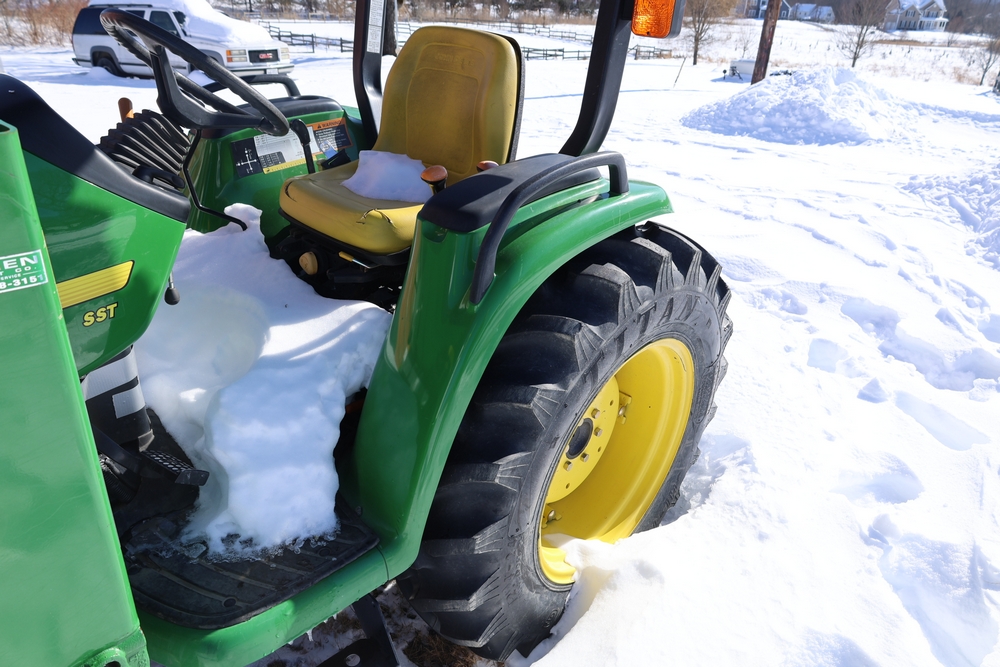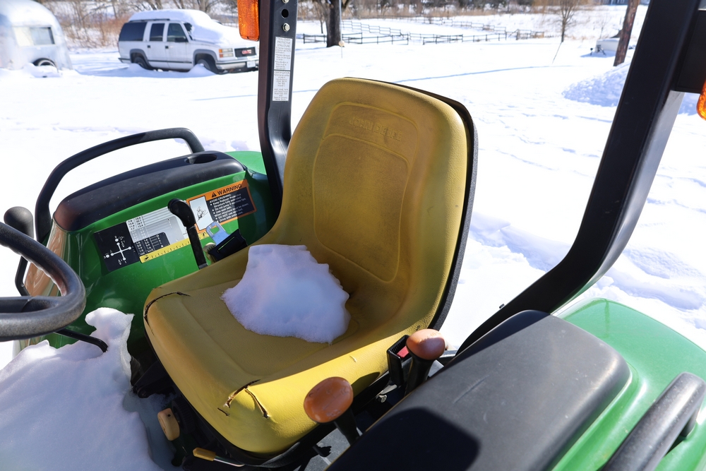 John Deere 4300 tractor equipped with a John Deere 430 front loader. Product Identification Number LV4300C335447. Hour meter displays 526.2 hours at time of photography. Open operator station with rollover protection structure and canopy. Three-point rear hitch present. Seller reports ran when parked, dead battery, high gear needs repair. Key available. Snow will be cleared to machine prior to pickup. No equipment is onsite to assist loading. Bring the proper tools, equipment, and help needed to load your items. No equipment is onsite to assist loading.