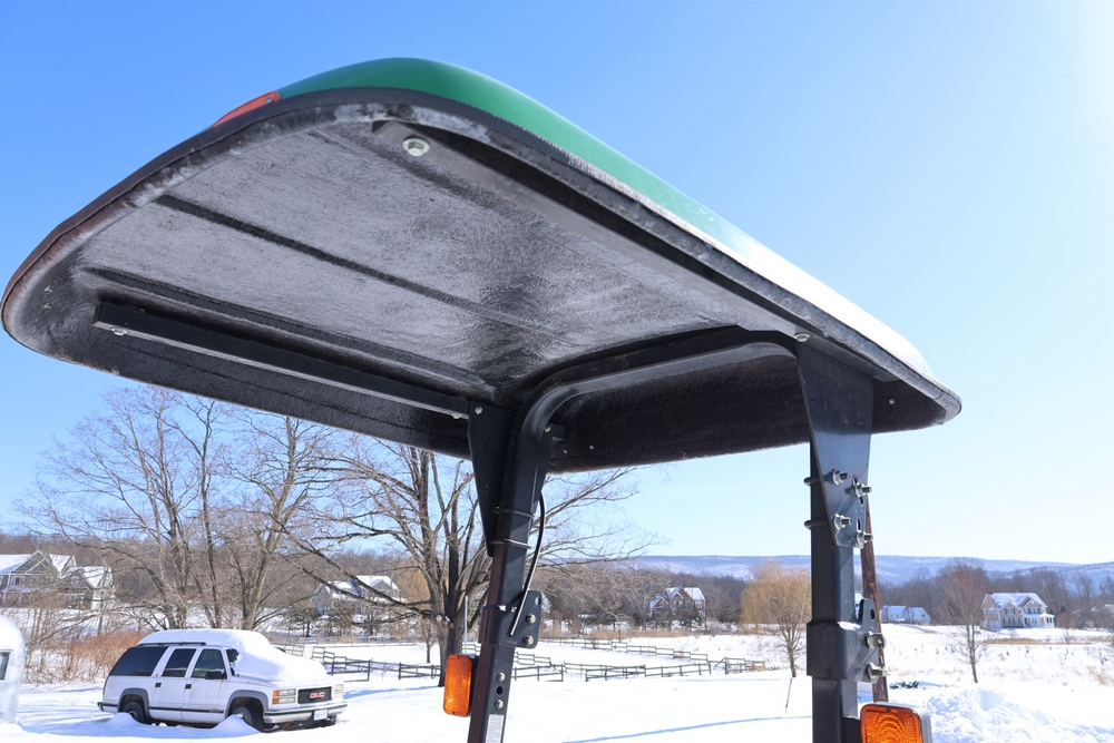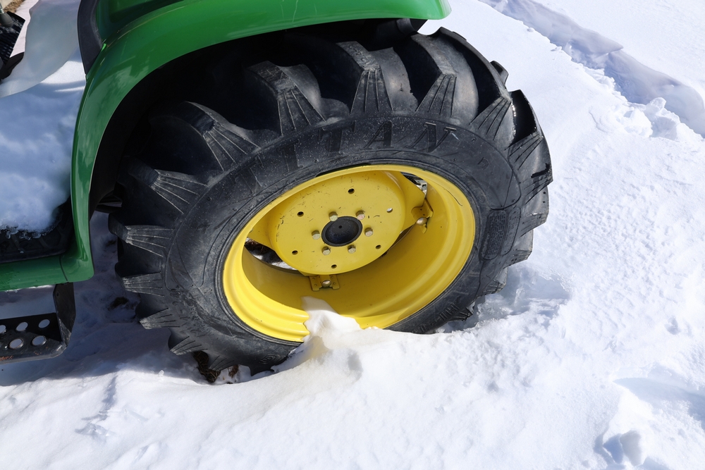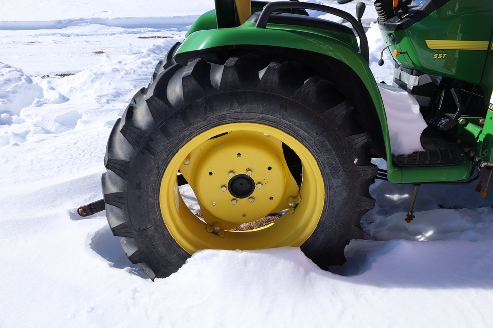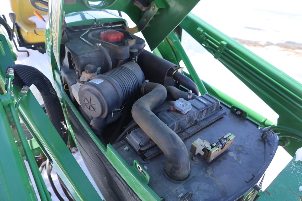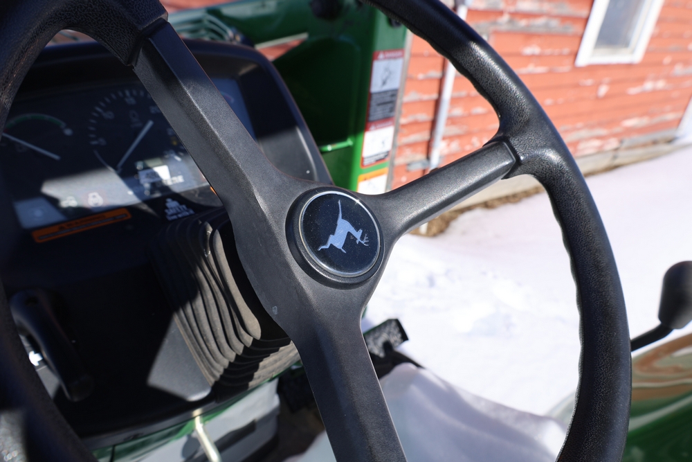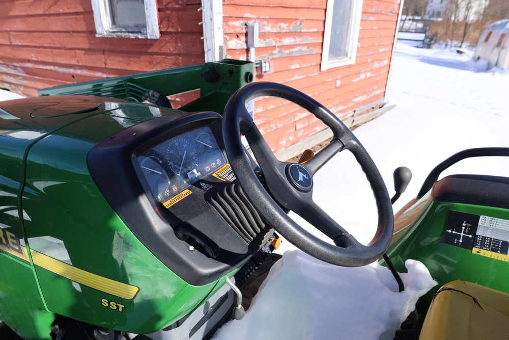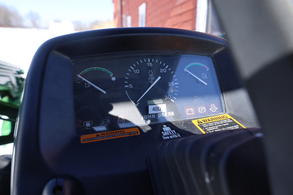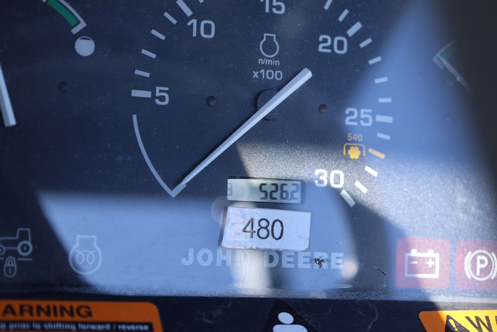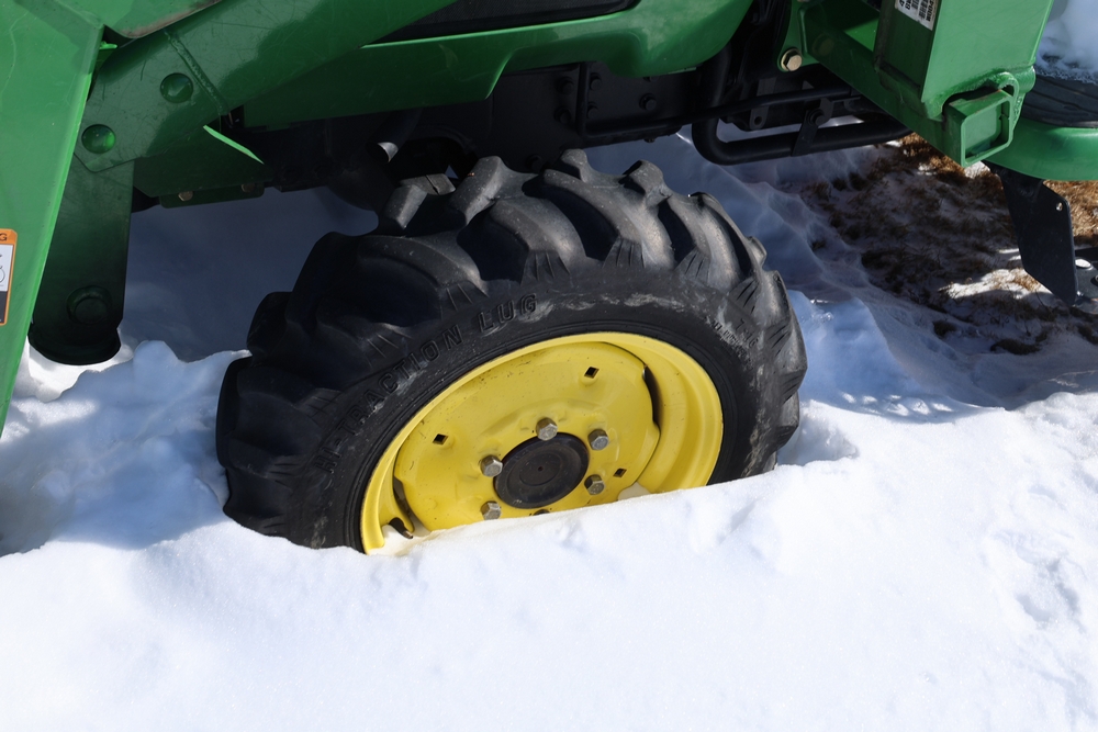 John Deere 4300 tractor equipped with a John Deere 430 front loader. Product Identification Number LV4300C335447. Hour meter displays 526.2 hours at time of photography. Open operator station with rollover protection structure and canopy. Three-point rear hitch present. Seller reports ran when parked, dead battery, high gear needs repair. Key available. Snow will be cleared to machine prior to pickup. No equipment is onsite to assist loading. Bring the proper tools, equipment, and help needed to load your items. No equipment is onsite to assist loading.