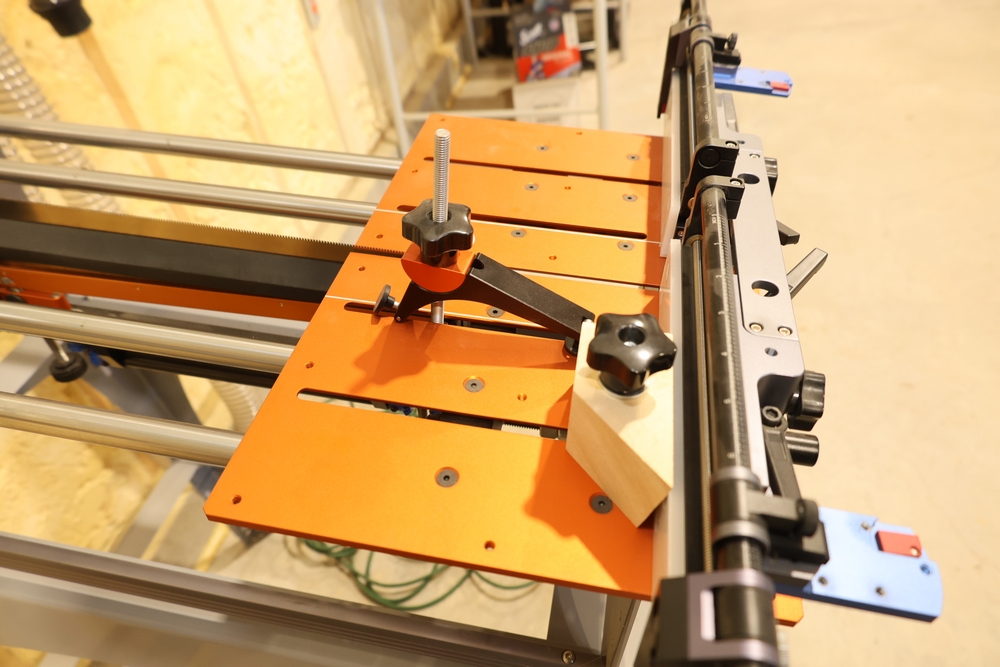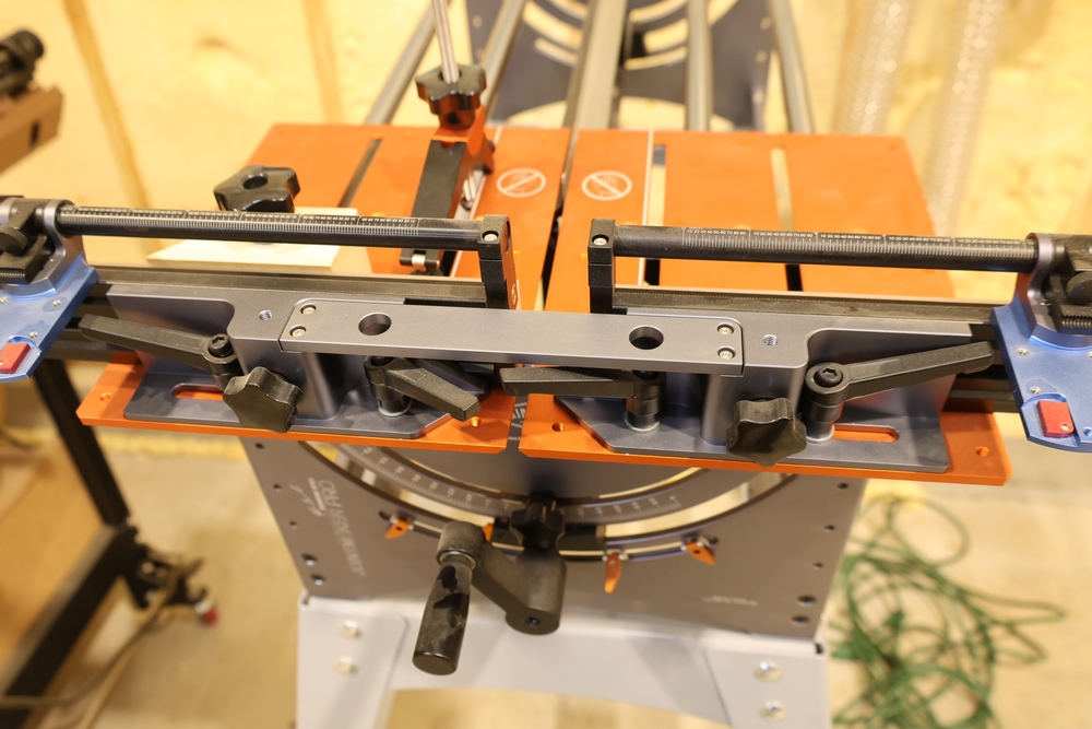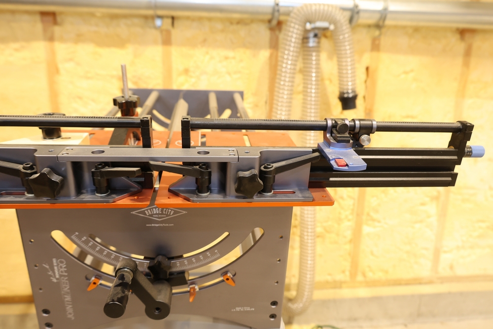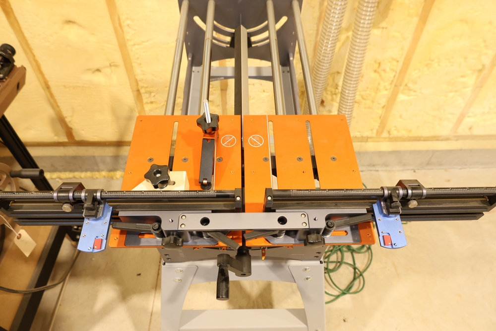 Bridge City Tool Works Jointmaker Pro Signature Series machine, mounted on a freestanding metal stand, featuring anodized aluminum tables, dual fence assemblies with integrated scales, angle adjustment arc, and multiple clamping and positioning components as shown. No equipment is onsite to assist loading. Bring the proper tools, equipment, and help needed to load your items. Seller reports: nearly all the powertool (especially Festools) are in fantastic condition, low low use and have been kept in climate controlled garage.