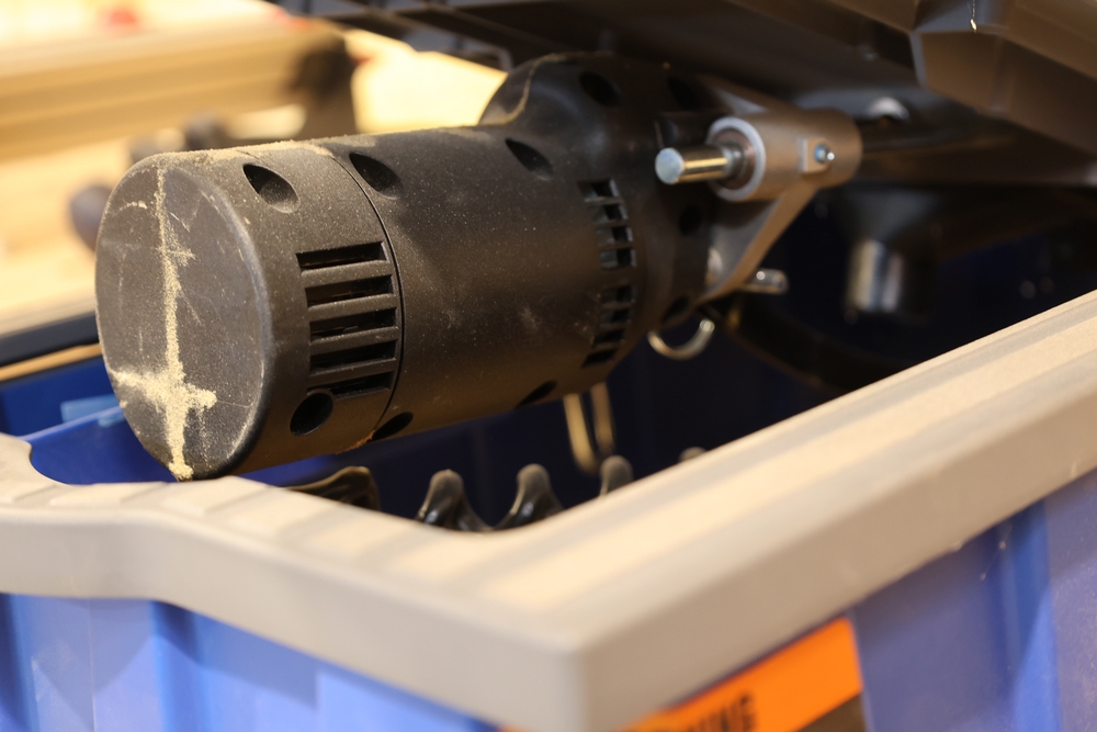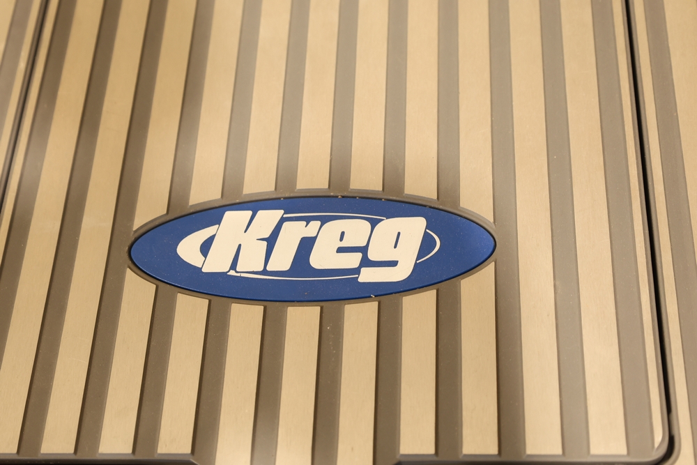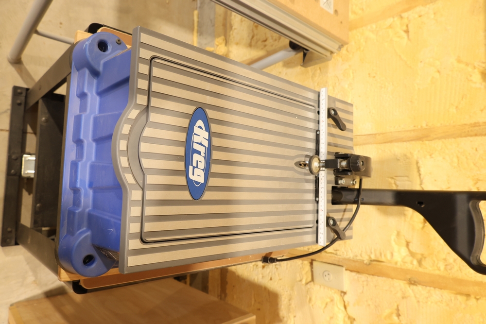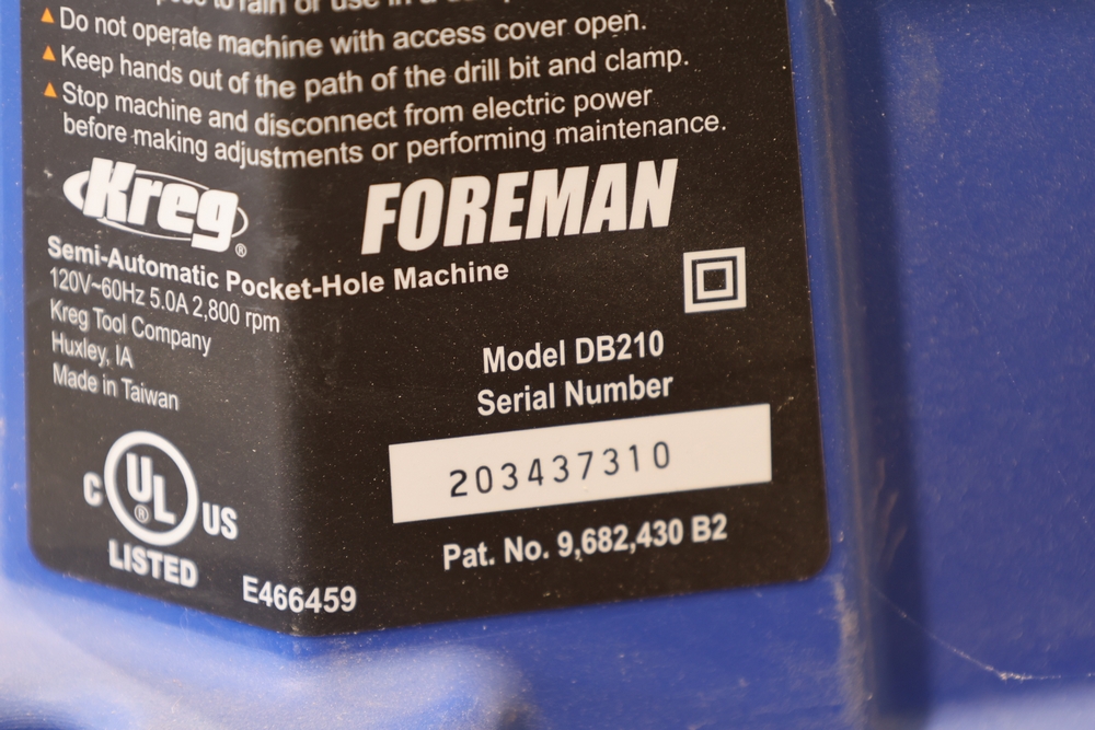 Kreg Foreman semi-automatic pocket-hole machine, model DB210, serial number 203437310, 120V electric unit mounted on a DeWalt rolling stand. Features an aluminum work surface with adjustable fence and clamping assembly as shown. Buyer is responsible for removal to the first disconnect. Excludes dust collection ductwork. No equipment is onsite to assist loading. Bring the proper tools, equipment, and help needed to load your items. Seller reports: nearly all the powertool (especially Festools) are in fantastic condition, low low use and have been kept in climate controlled garage.