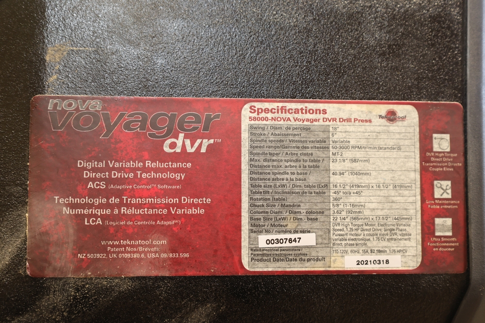 Nova Voyager DVR drill press, model 58000, equipped with DVR direct drive motor. Serial number 00307647. Mounted on a floor base and fitted with a DP-Pro 36 fence system. Includes a Llambrich JK-160-MT2 chuck with 3–16 mm (0.118–0.630 in.) capacity. Buyer is responsible for removal to the first disconnect. Excludes dust collection ductwork. No equipment is onsite to assist loading. Bring the proper tools, equipment, and help needed to load your items. Seller reports: nearly all the powertool (especially Festools) are in fantastic condition, low low use and have been kept in climate controlled garage.