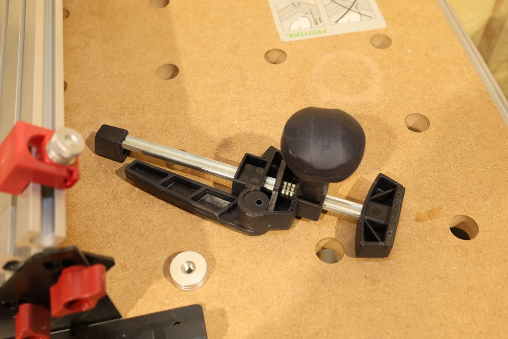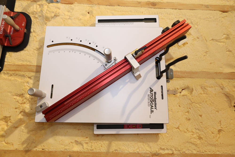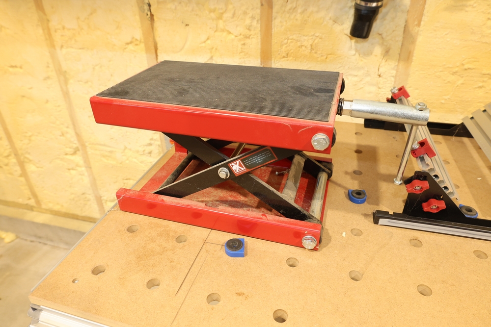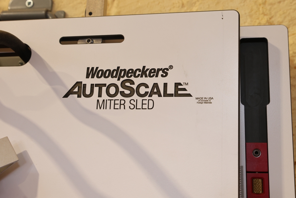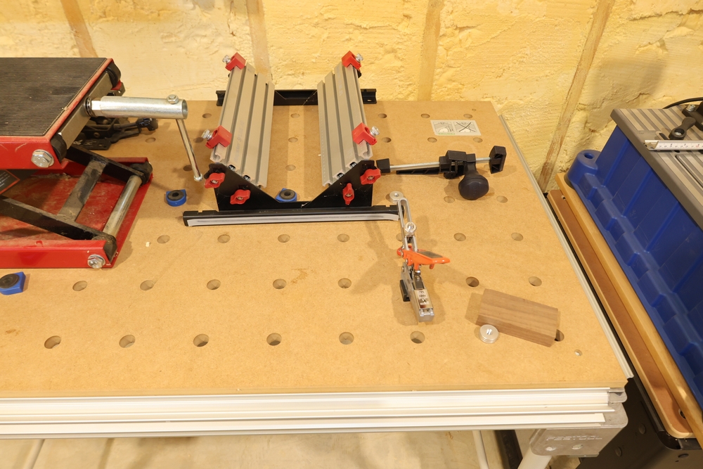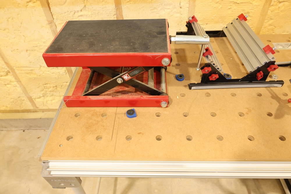 Festool MFT work table with perforated top and folding legs, paired with a Woodpeckers AutoScale miter sled featuring an Exact-90 gauge, a Woodpeckers spline jig, an Armor clamp, a Trend roller stand, and a red scissor-style lift table. No equipment is onsite to assist loading. Bring the proper tools, equipment, and help needed to load your items.