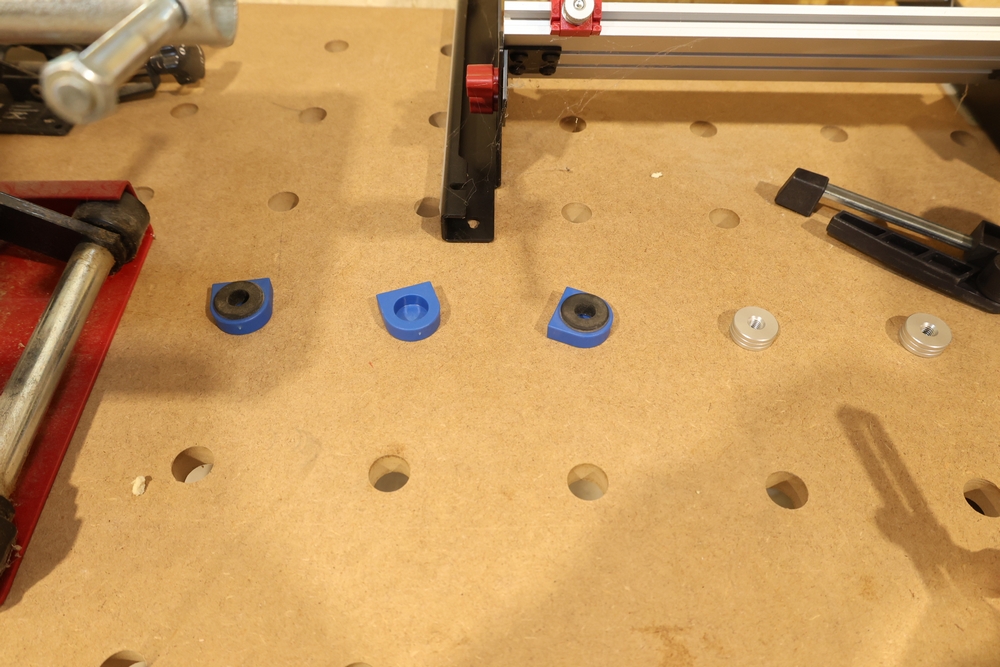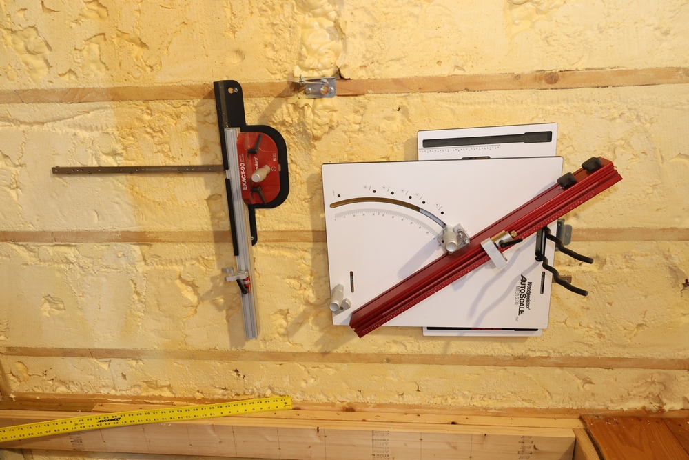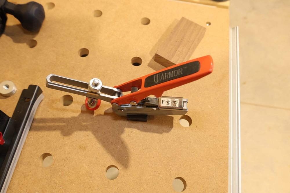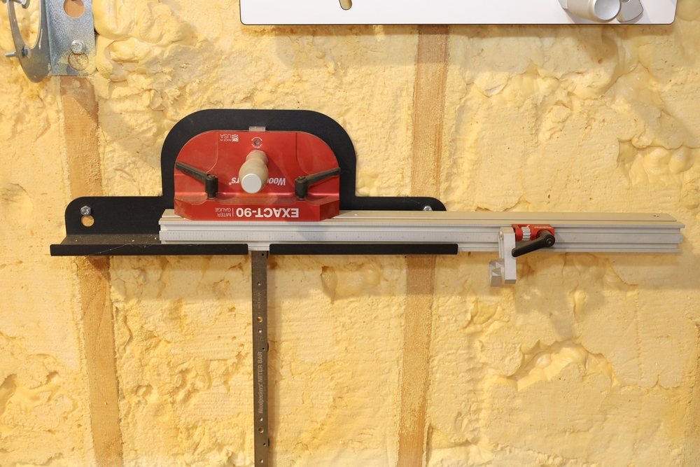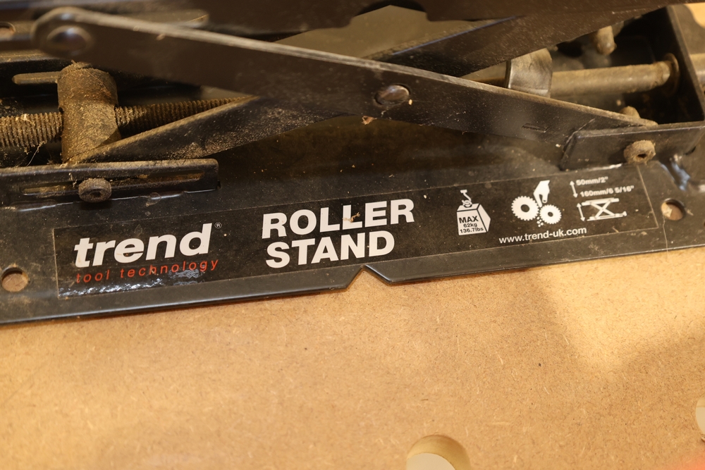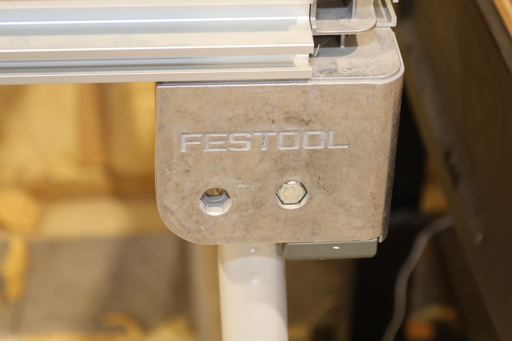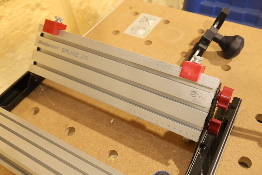 Festool MFT work table with perforated top and folding legs, paired with a Woodpeckers AutoScale miter sled featuring an Exact-90 gauge, a Woodpeckers spline jig, an Armor clamp, a Trend roller stand, and a red scissor-style lift table. No equipment is onsite to assist loading. Bring the proper tools, equipment, and help needed to load your items.