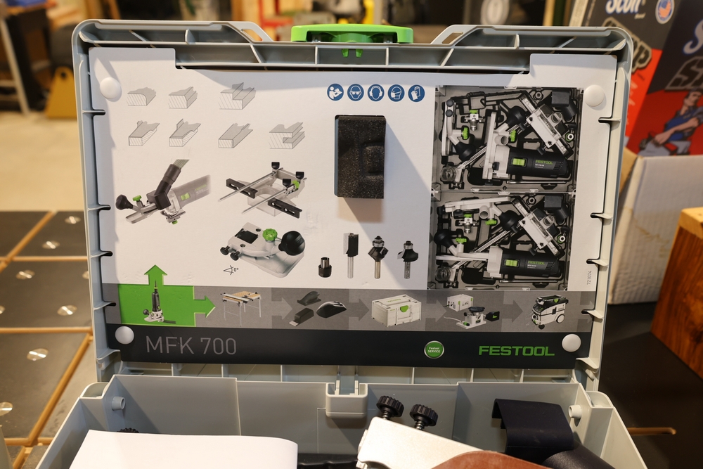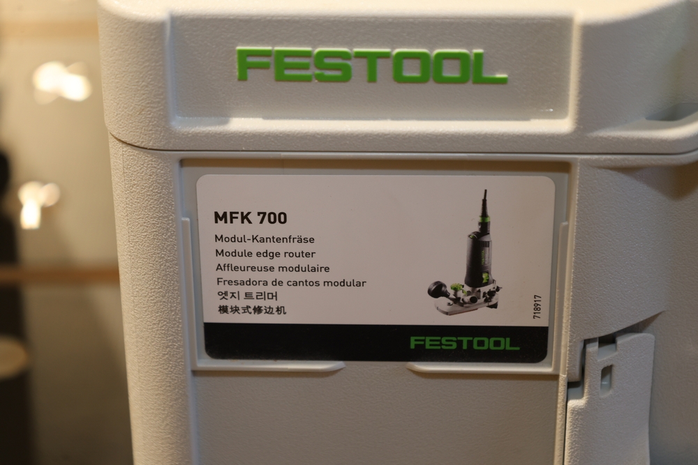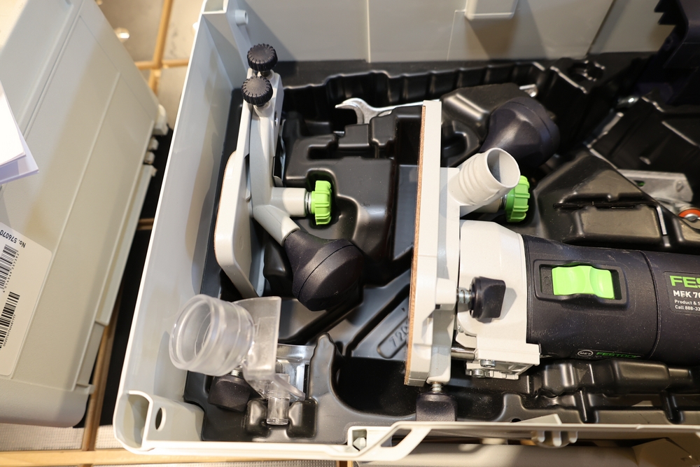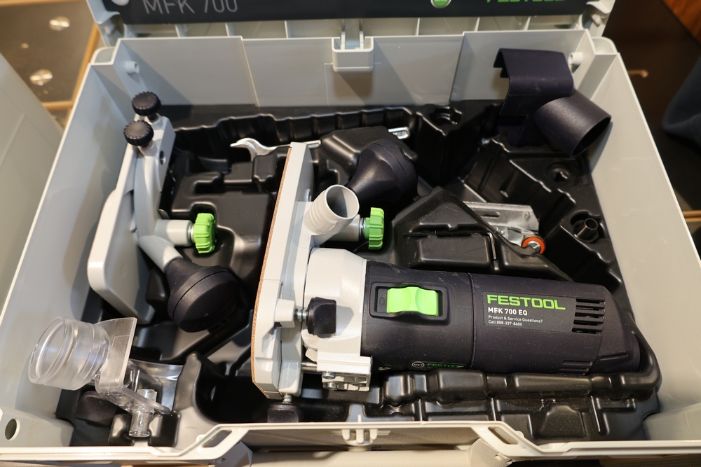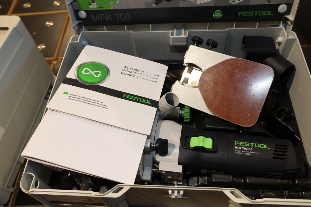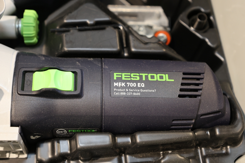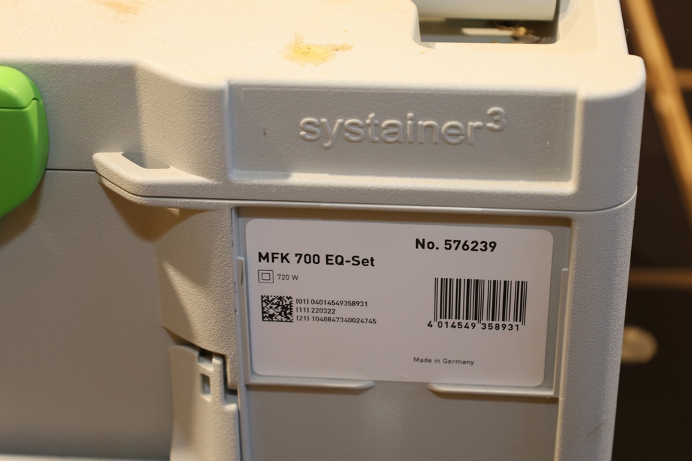 Festool MFK 700 EQ-Set modular edge router, 720W, model number 576239, housed in a Festool Systainer storage case, including interchangeable routing bases and attachments as pictured, along with manuals and accessories contained within the case. No equipment is onsite to assist loading. Bring the proper tools, equipment, and help needed to load your items. Seller reports: nearly all the powertool (especially Festools) are in fantastic condition, low low use and have been kept in climate controlled garage.