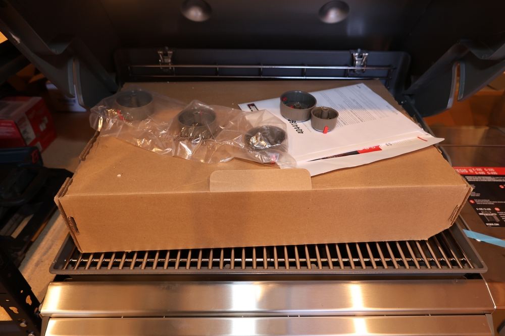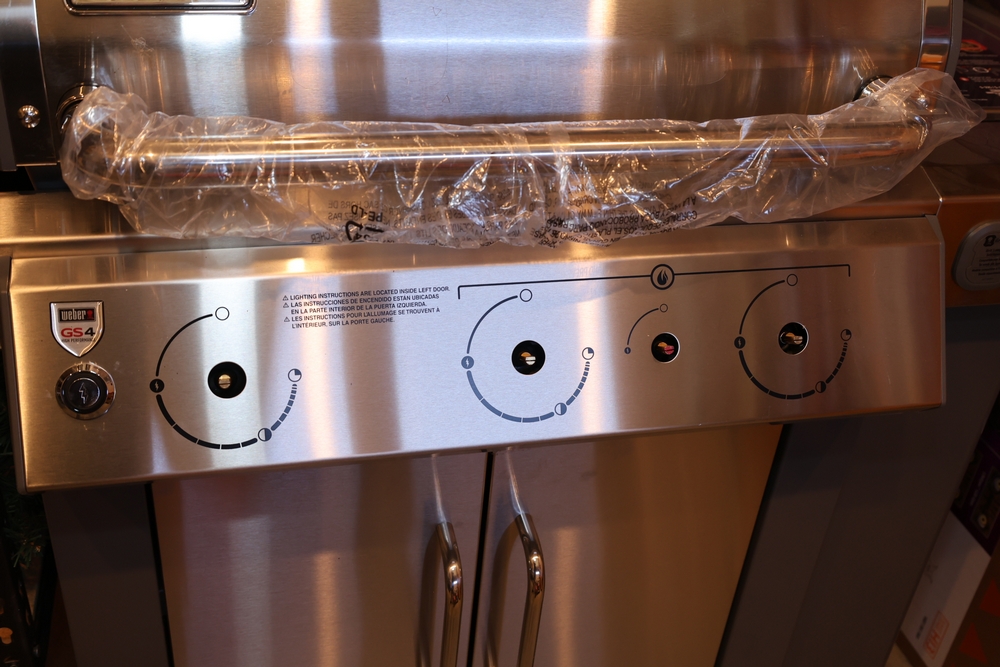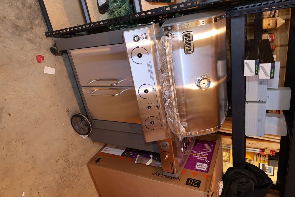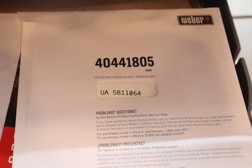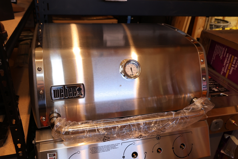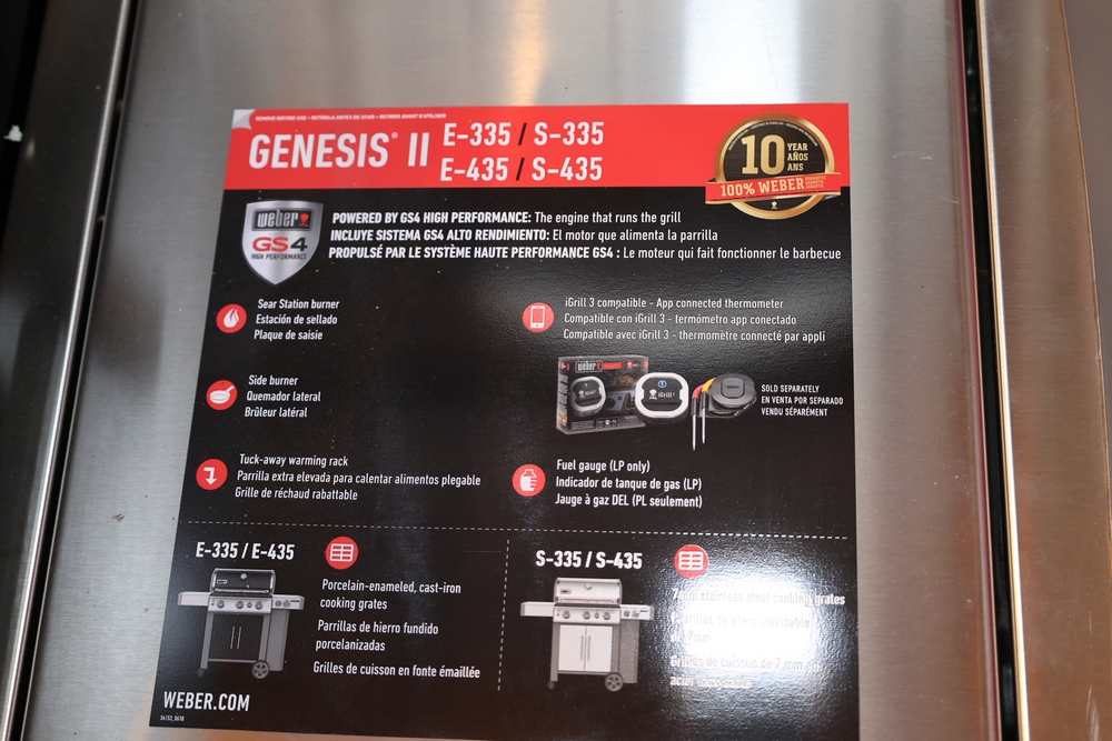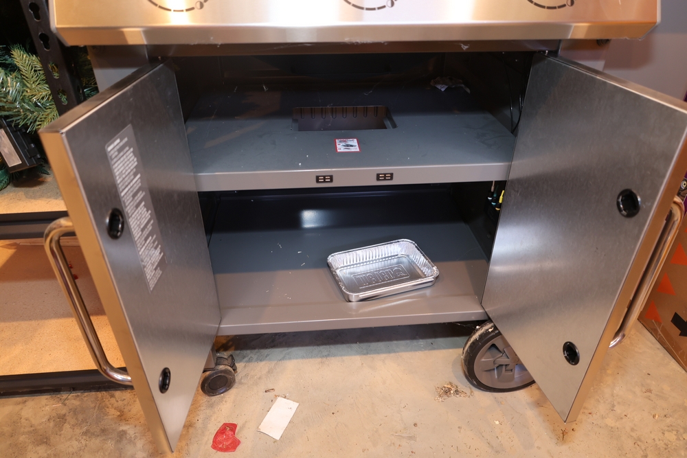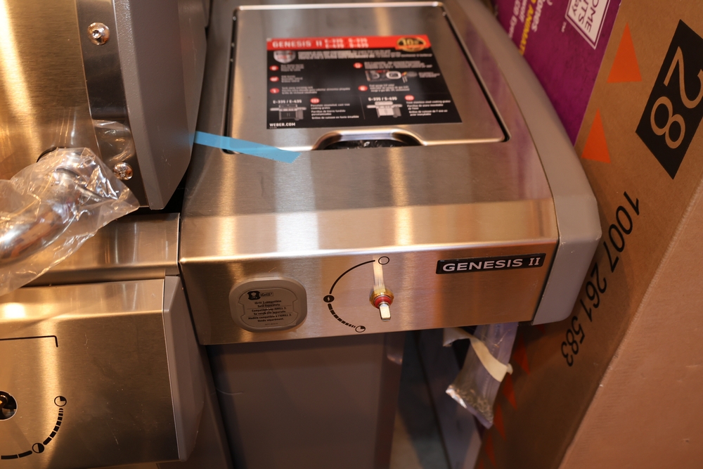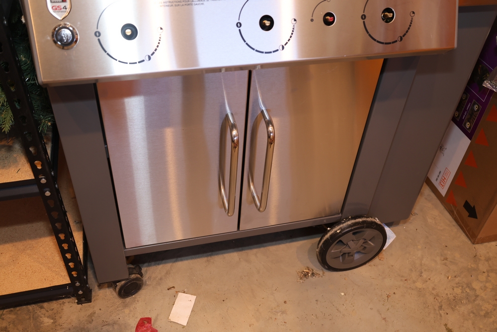 Weber Genesis II gas grill, model S-335, stainless steel construction, natural gas configuration, serial number UA 5811064, mounted on cart with double cabinet doors, side burner, control knobs, built-in thermometer, and lower storage shelf, includes Weber grill cover, owner’s manual packet, and additional boxed components and hardware. No equipment is onsite to assist loading. Bring the proper tools, equipment, and help needed to load your items.