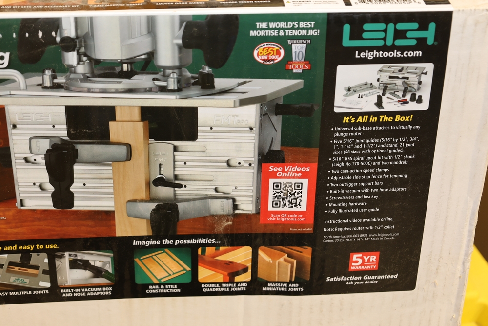Leigh FMT Pro Mortise and Tenon Jig, model FMT Pro, in original box with foam inserts, includes user guide, mounting hardware, clamps, guides, and associated components as packaged. No equipment is onsite to assist loading. Bring the proper tools, equipment, and help needed to load your items.