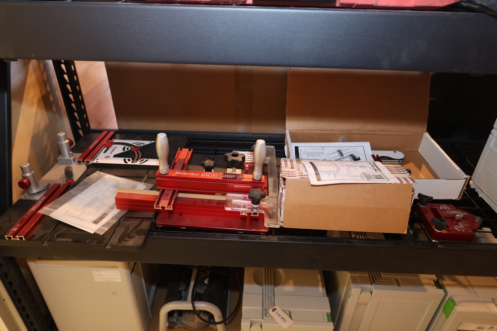 Woodpeckers woodworking tool lot including a Woodpeckers Multi-Function Router Base with original box and manual, Woodpeckers Iron-Grip Coping Sled, Woodpeckers MortiseMatch, Woodpeckers ThinRip Guide, and Woodpeckers Auto-Line Drill Guide with manual, featuring anodized aluminum construction and adjustable components. No equipment is onsite to assist loading. Bring the proper tools, equipment, and help needed to load your items. Seller reports: nearly all the powertool (especially Festools) are in fantastic condition, low low use and have been kept in climate controlled garage.