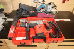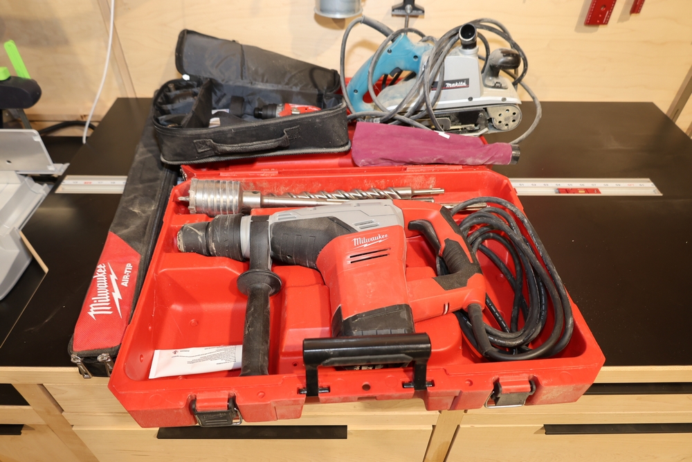 Milwaukee 1-9/16 in. SDS-Max rotary hammer, Cat. No. 5317-20, 120V, 10.5A, 0–300 RPM, 3,000 BPM, in hard case with side handle, assorted SDS-Max drill bits and core bit; Milwaukee M12 FUEL 3/8 in. installation drill/driver, Cat. No. 2505-20; Makita 4 in. x 24 in. belt sander, Model 9403, 120V, 11A, 60Hz; and Milwaukee AIR-TIP accessory in zippered case. No equipment is onsite to assist loading. Bring the proper tools, equipment, and help needed to load your items. Seller reports: nearly all the powertool (especially Festools) are in fantastic condition, low low use and have been kept in climate controlled garage.