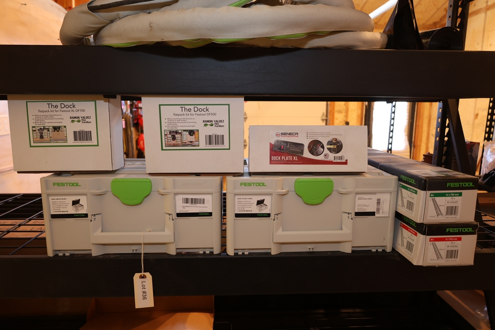Festool Domino XL DF 700 EQ-Set US joining machine, 720W, No. 576431, in Systainer with accessory and tenon assortment including two Ramon Valdez Fine Furniture “The Dock” flat pack kits for Festool DF500 and DF700, one Seneca Woodworking Dock Plate XL for Festool Domino DF500 and DF700, one Festool DS/XL D8/D10 306 BU Domino XL beechwood tenon assortment Systainer, one Festool DS/XL D12/D14 128 BU Domino XL beechwood tenon assortment Systainer, one Festool BU 14 x 750 mm Domino tenon pack, and one Festool BU 8 x 750 mm Domino tenon pack. No equipment is onsite to assist loading. Bring the proper tools, equipment, and help needed to load your items. Seller reports: nearly all the powertool (especially Festools) are in fantastic condition, low low use and have been kept in climate controlled garage.