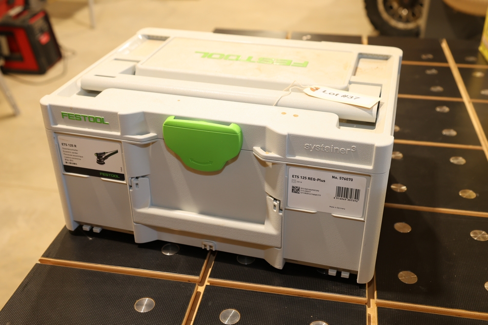 Festool ETS 125 REQ-Plus 5" random orbit sander, 250W, model no. 576070, housed in a Festool Systainer case and including the sander unit, detachable dust collection bag, edge protector, sanding pad, power cord, and assorted documentation and accessories contained within the case. No equipment is onsite to assist loading. Bring the proper tools, equipment, and help needed to load your items. Seller reports: nearly all the powertool (especially Festools) are in fantastic condition, low low use and have been kept in climate controlled garage.