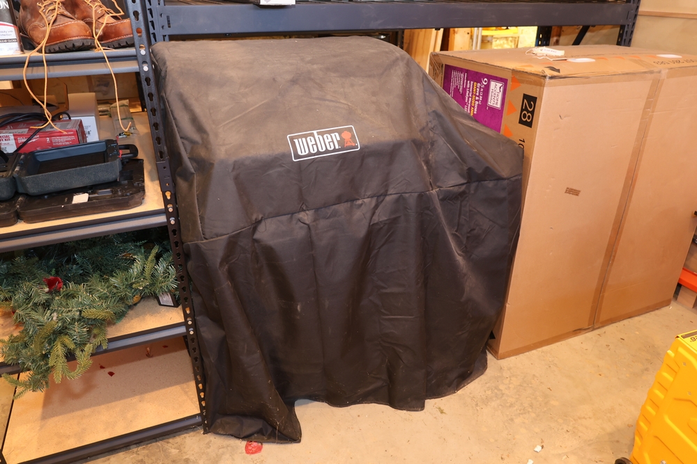 Weber Genesis II gas grill, model S-335, stainless steel construction, natural gas configuration, serial number UA 5811064, mounted on cart with double cabinet doors, side burner, control knobs, built-in thermometer, and lower storage shelf, includes Weber grill cover, owner’s manual packet, and additional boxed components and hardware. No equipment is onsite to assist loading. Bring the proper tools, equipment, and help needed to load your items.