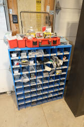 Fastenal blue metal wall-mounted hardware organizer with multiple labeled compartments containing assorted bolts, hex nuts, flat washers, split lock washers, nylon insert lock nuts, and miscellaneous fasteners in various sizes, along with red plastic organizer bins and assorted packaged screws, anchors, and small hardware items stored within the unit. No equipment is onsite to assist loading. Bring the proper tools, equipment, and help needed to load your items.