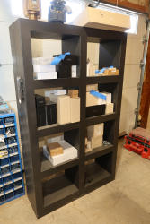 Black metal 8-cube shelving unit measuring approximately 48 inches wide, 16 inches deep, and 72 inches high. Features a rectangular frame with eight open storage compartments in a two-by-four configuration and a flat top surface. Freestanding design suitable for shop, garage, office, or retail display use. Contents not included. No equipment is onsite to assist loading. Bring the proper tools, equipment, and help needed to load your items.
