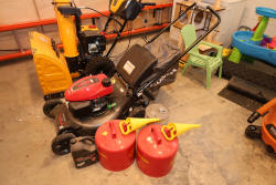 Honda HRN216VKAD walk behind lawn mower with GCV170 engine and 21 inch cutting deck, featuring Smart Drive control and Easy Start auto choke system, includes rear grass collection bag, two Eagle metal safety gas cans, one metal fuel can, and one Echo premium bar and chain oil container, all partially filled. No equipment is onsite to assist loading. Bring the proper tools, equipment, and help needed to load your items.