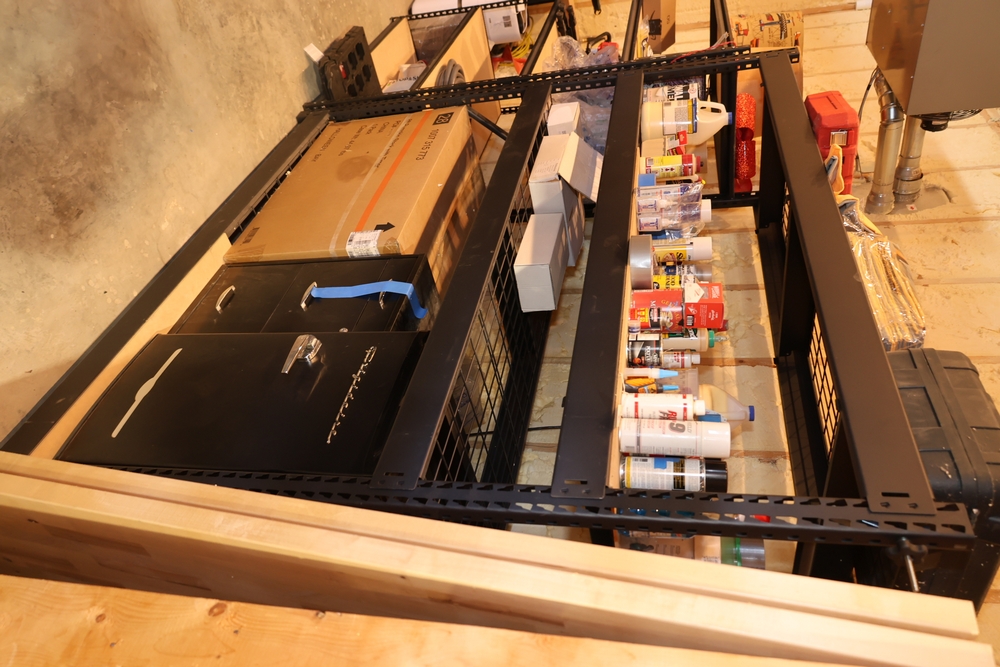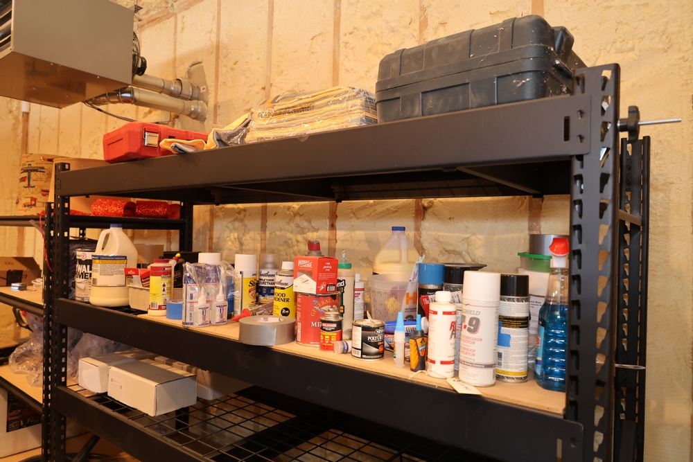 Assorted contents from storage shelves including Royal Oak Tumbleweeds natural fire starters, long fireplace matches, Milwaukee Packout item, Husky work light, Bosch Professional GLL 2-20 laser level in case, DeWalt DW7670 8 inch dado set with case, animated inflatable Halloween werewolf in box, Pebblestone Carrara flower natural stone tile sheets, Asian Statuary 6x12 polished tile, coiled hoses, folding tripod, cat furniture, children’s water play table, portable ice maker, white storage cabinet, assorted cleaning and painting supplies including drywall primer and Titebond III wood glue, and other related household and hardware items. Excludes shelves and other lots. Buyer must take all. No equipment is onsite to assist loading. Bring the proper tools, equipment, and help needed to load your items.