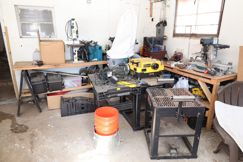 Contents of workshop room including DeWalt DW735 13 inch thickness planer, Bosch GCM12SD 12 inch dual bevel glide miter saw, Rikon 10-3061 10 inch deluxe band saw, Makita SP6000J track saw, Craftsman CMEW020 6 inch variable speed bench jointer, Rockwell tabletop saw, 2 HP dust collector, Porter Cable drill press, WEN multi purpose planer miter saw stand, assorted shop vacuums, toolboxes, hoses, extension cords, propane cylinders, wheelbarrow, and miscellaneous hand tools and shop accessories; all tools are being sold for parts or repair, believed to have been operational when removed from service and stored in a non temperature and non humidity controlled environment. No equipment is onsite to assist loading. Bring the proper tools, equipment, and help needed to load your items.