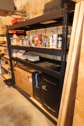 Lot of five black metal storage shelving units, includes two different styles, larger units measure approximately 8 feet long by 24 inches deep, smaller units measure approximately 48 inches wide, shelving units only, contents not included No equipment is onsite to assist loading. Bring the proper tools, equipment, and help needed to load your items.