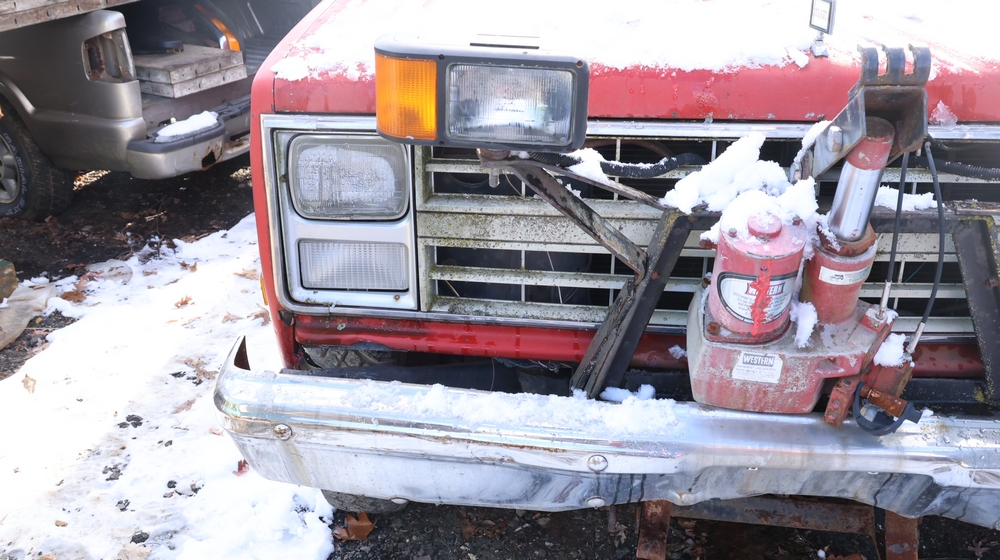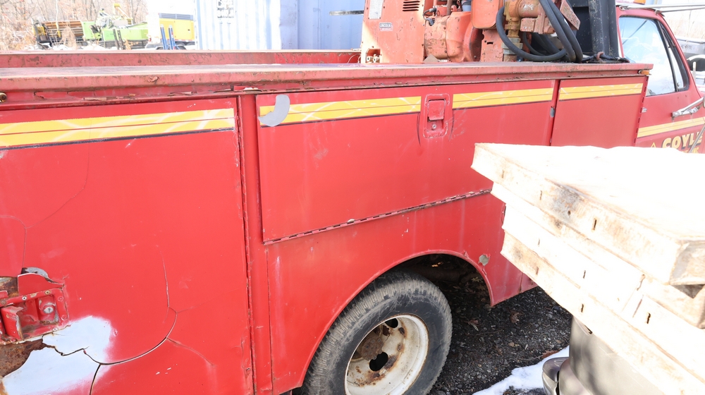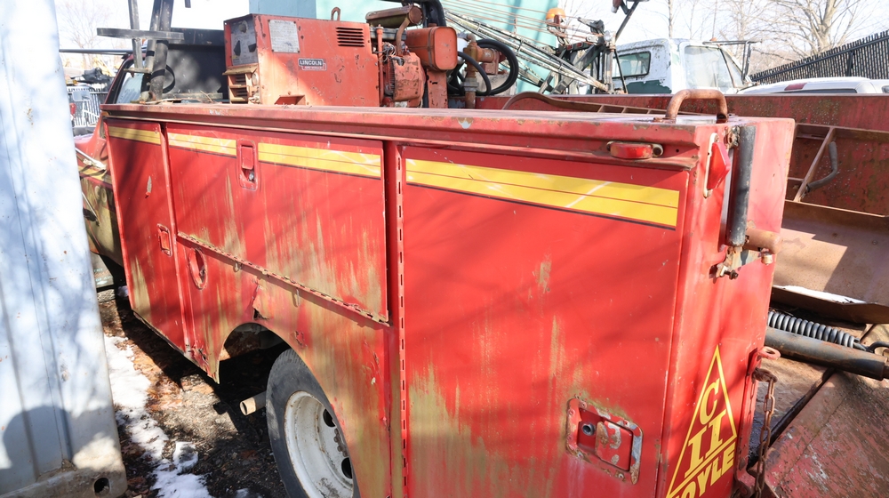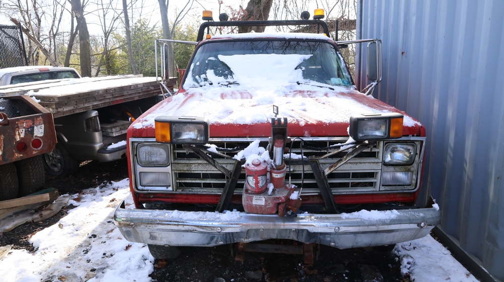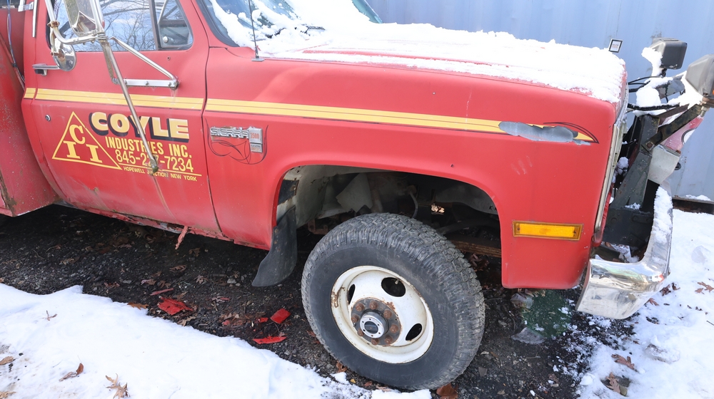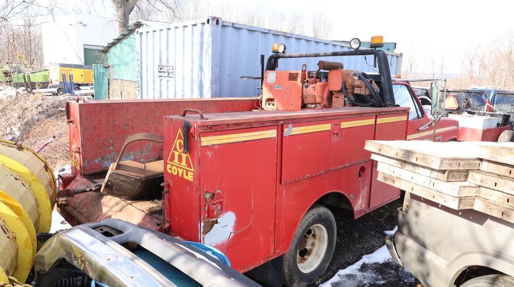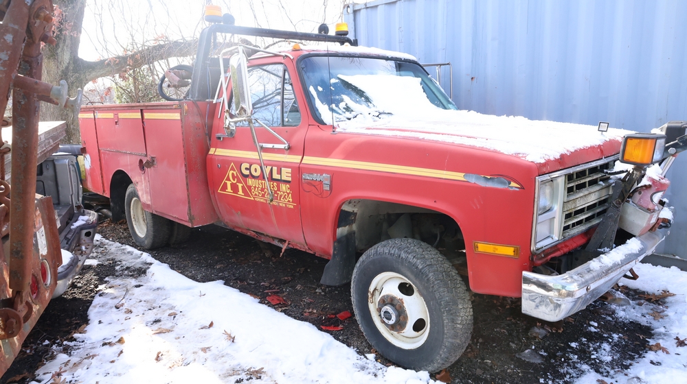 Items include Landhero mini excavator; 1974 General Motors tow truck; 1988 GMC V3500 Regular Cab 4WD; Fisher Pro-Caster industrial sander unit; Landhonor LHR-LB9510 leaf blower; Milwaukee hand truck; assorted stacked plywood sheets; Pittsburgh mechanics tool set; assorted traffic control safety equipment; 52cc gas powered multi tool power head with hedge trimmer attachment; Quick Cable electric tool; pink rigid foam insulation boards, welded wire mesh panels, Husky contractor clean up bags box, Grip Rite construction screws; PVC pipes & fittings; assorted dimensional lumbar & more. Items are located in Peekskill, NY.