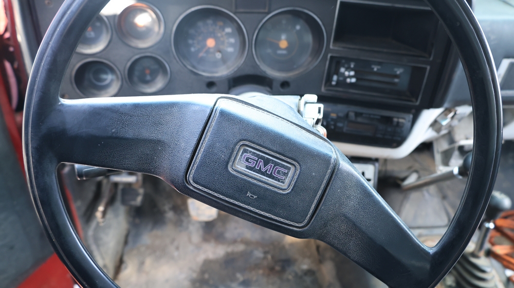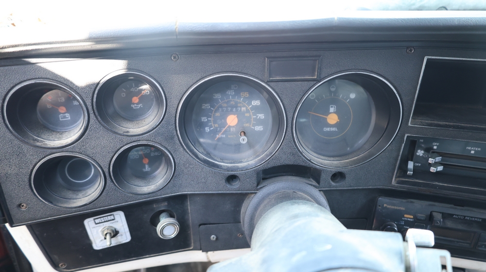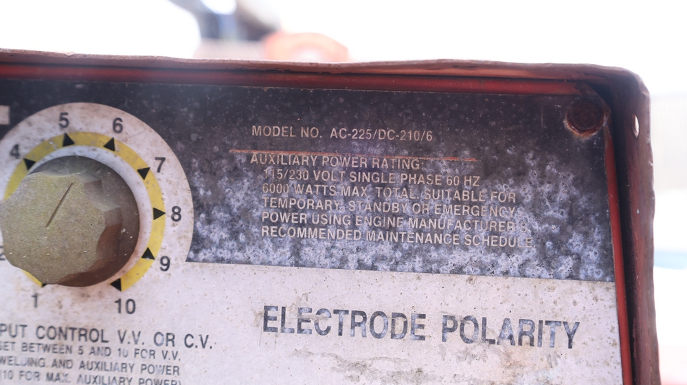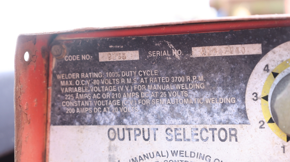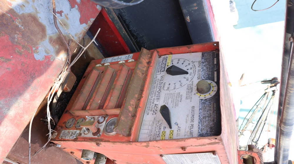 1988 GMC V3500 Regular Cab 4WD with a 6.2L V8 OHV 16V diesel engine. VIN: 1GDHV34J2JJ501424. Odometer reading: 37747. Body: Utility/service truck configuration with side tool compartments, rear work bed, and roof-mounted beacon lights. Equipment in bed includes a Lincoln welder/generator unit with AC-225/DC-210/6 output and auxiliary power rating of 115/230V single phase 60 Hz, 6000 watts max total. Interior includes manual transmission with floor shifter, 4WD transfer case shifter, and GMC dashboard controls. For parts or repair, must be towed.