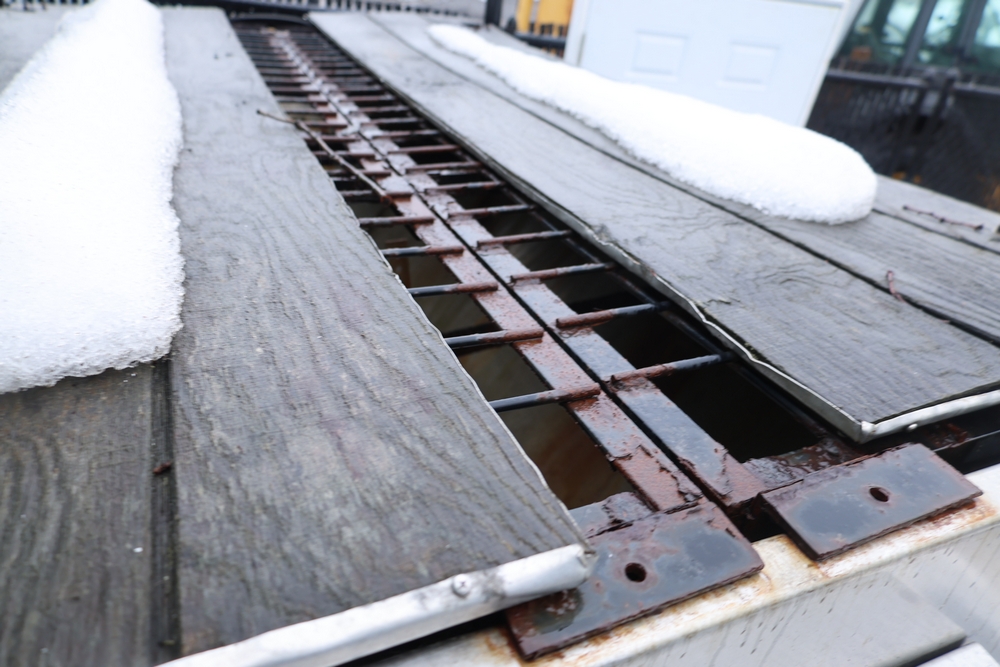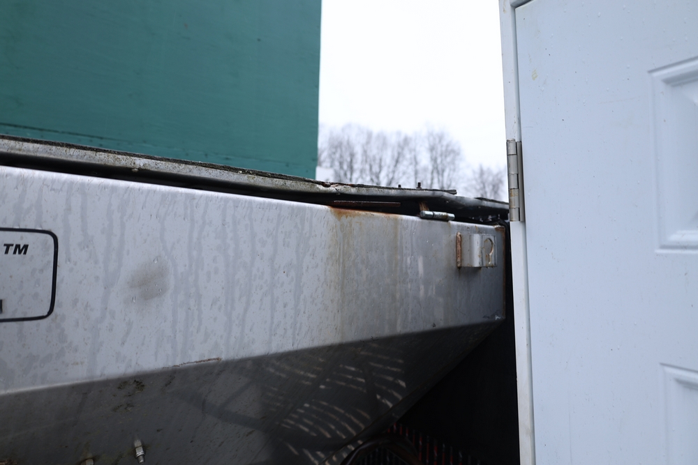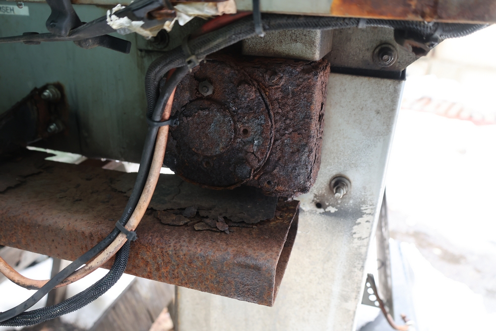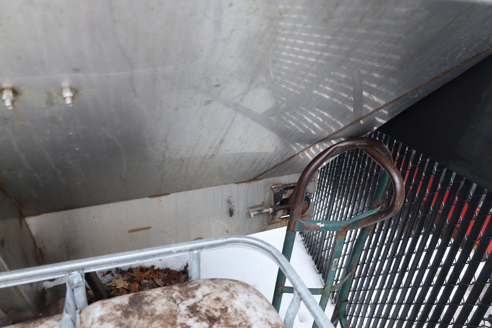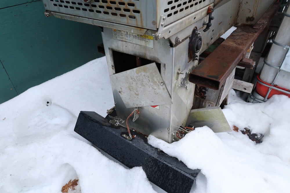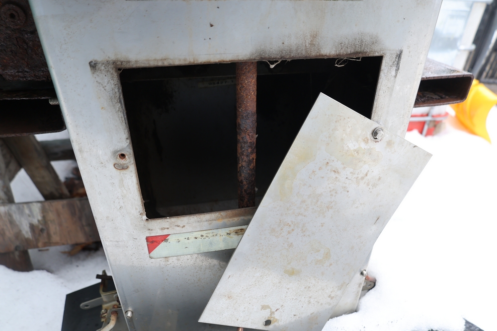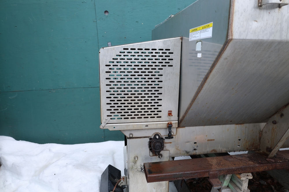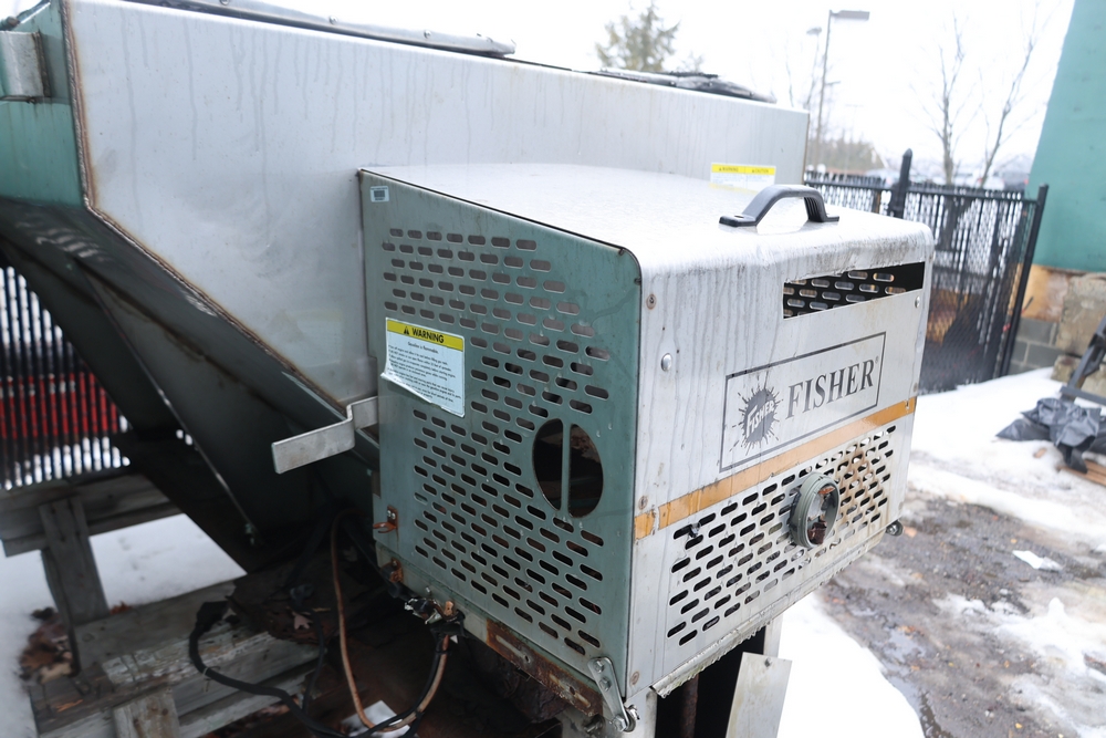 Fisher Pro-Caster industrial sander unit with large hopper-style body and enclosed housing, missing the motor. Seller reports: it has a new conveyor chain.