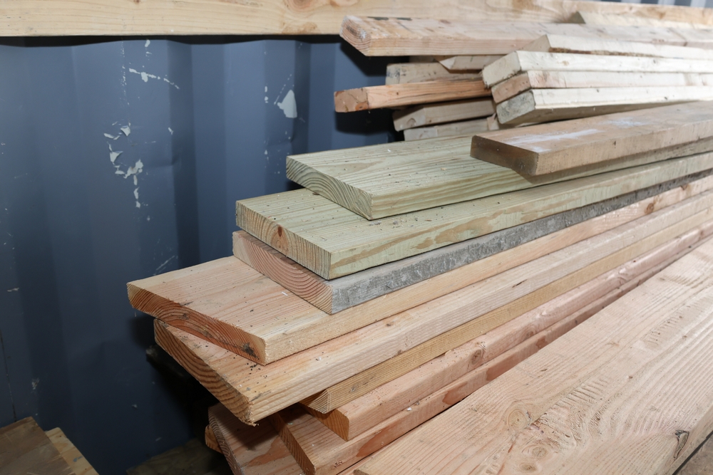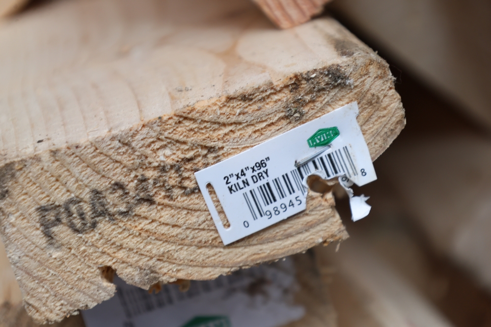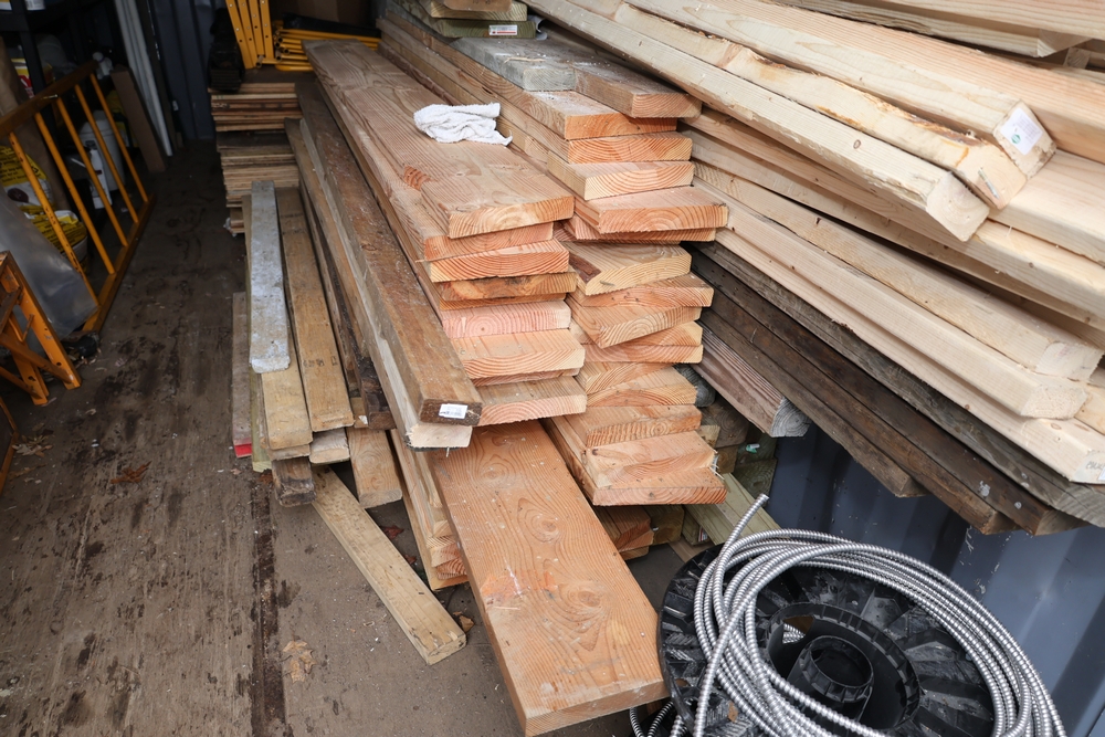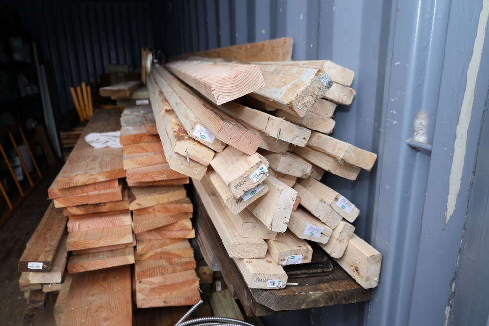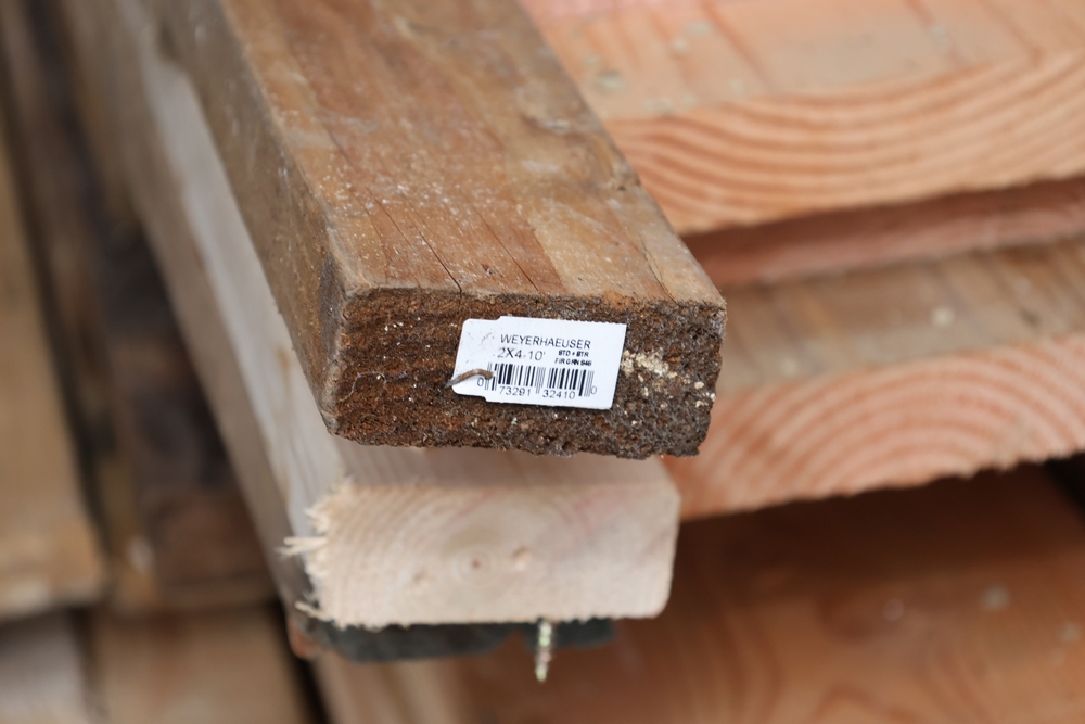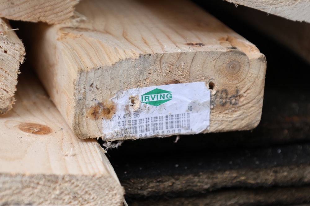 Assorted dimensional lumber including multiple 2 inch x 4 inch x 96 inch kiln dry boards labeled Irving, 2 inch x 4 inch x 10 foot boards labeled Weyerhaeuser, pressure treated 4 inch x 4 inch posts, and additional mixed length boards and planks stacked in a shipping container. Excludes other lots. Buyer must take all.