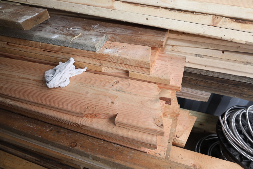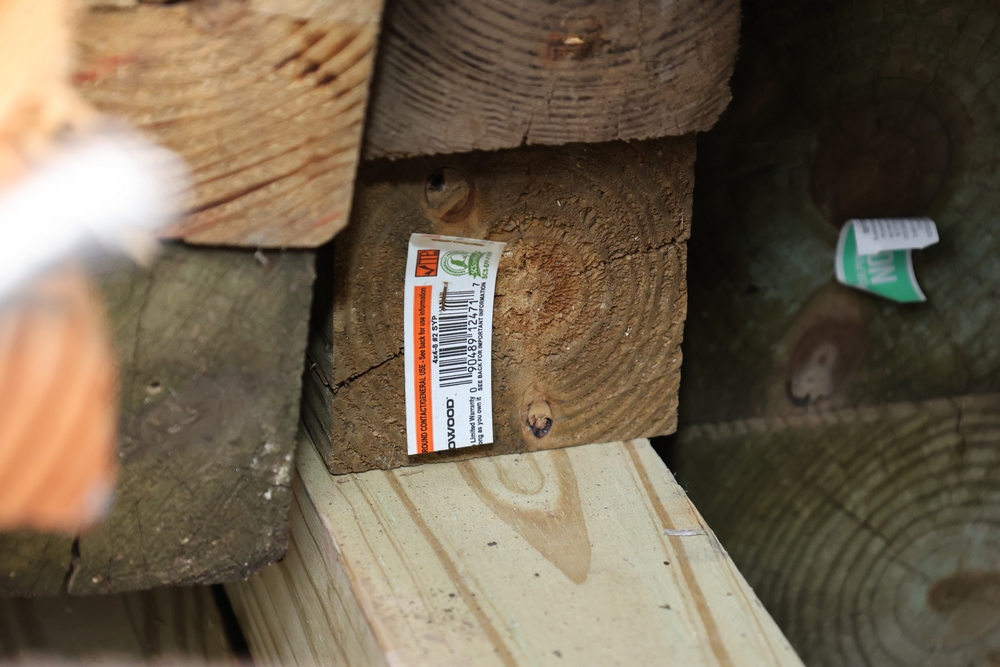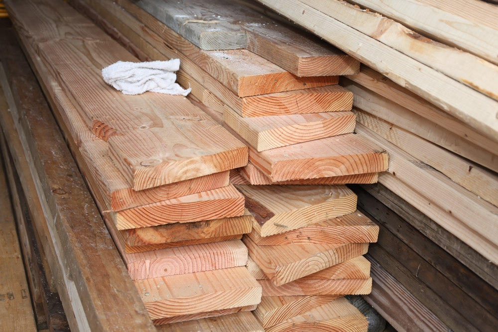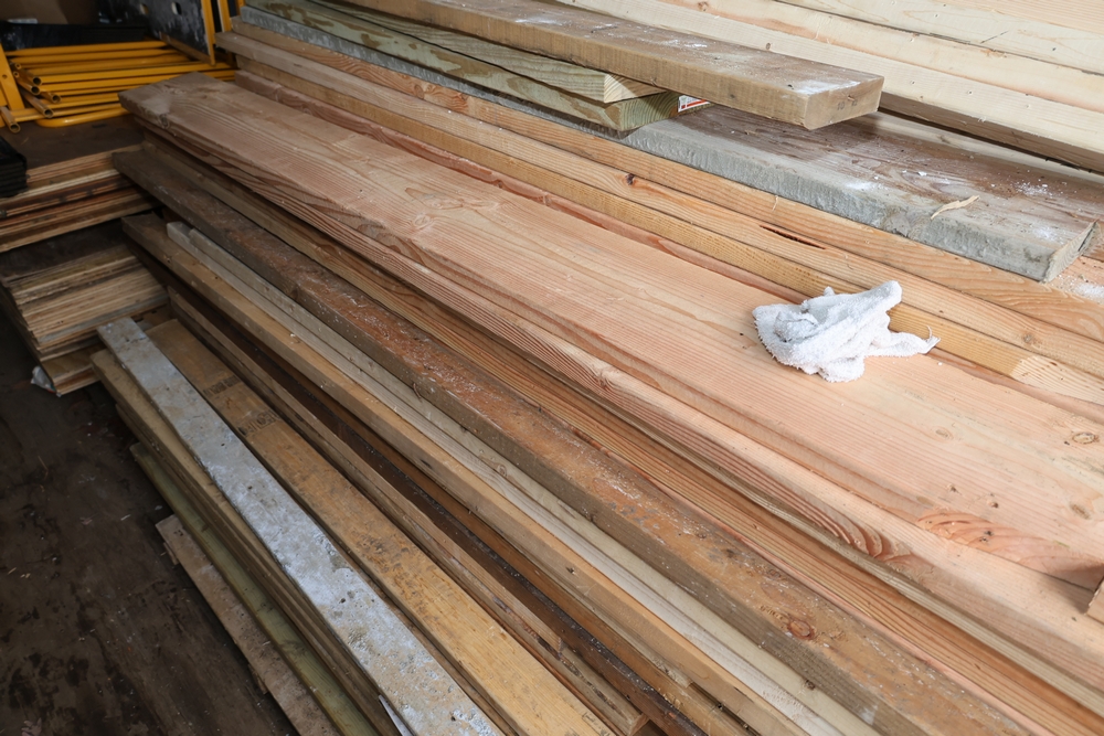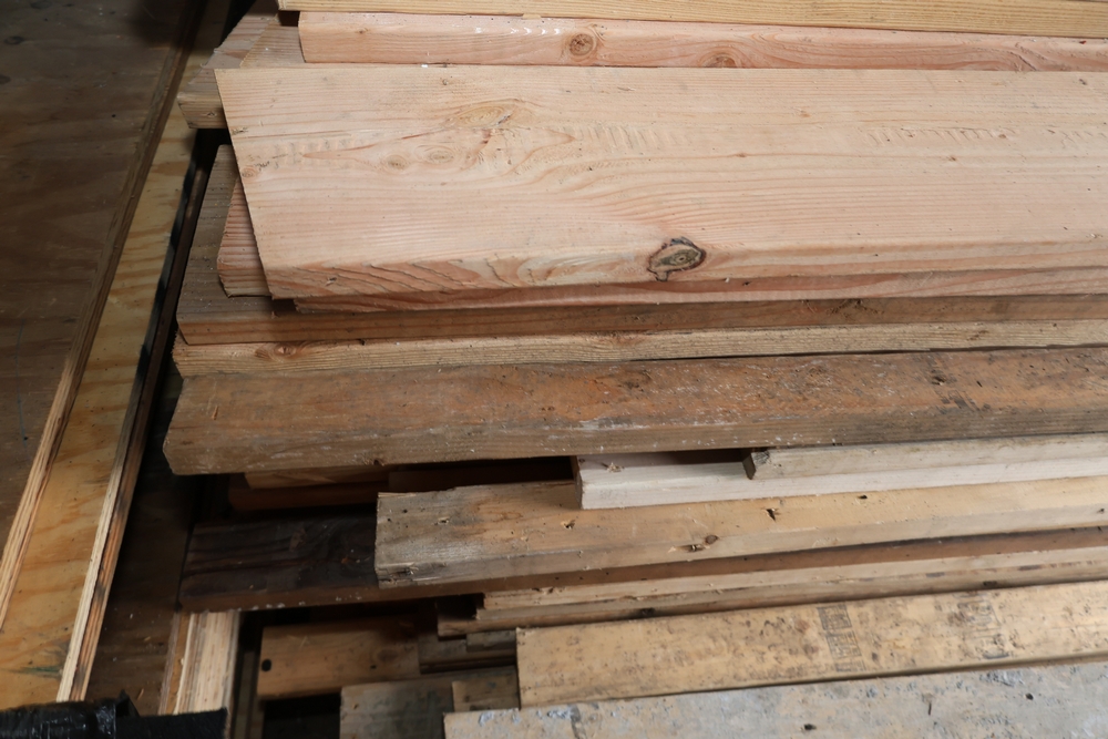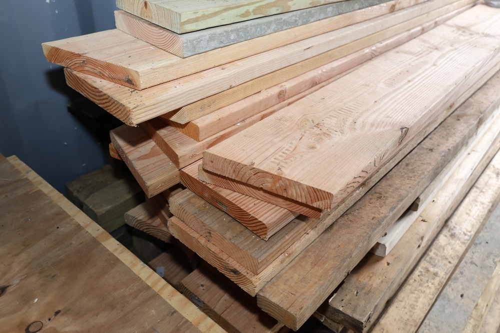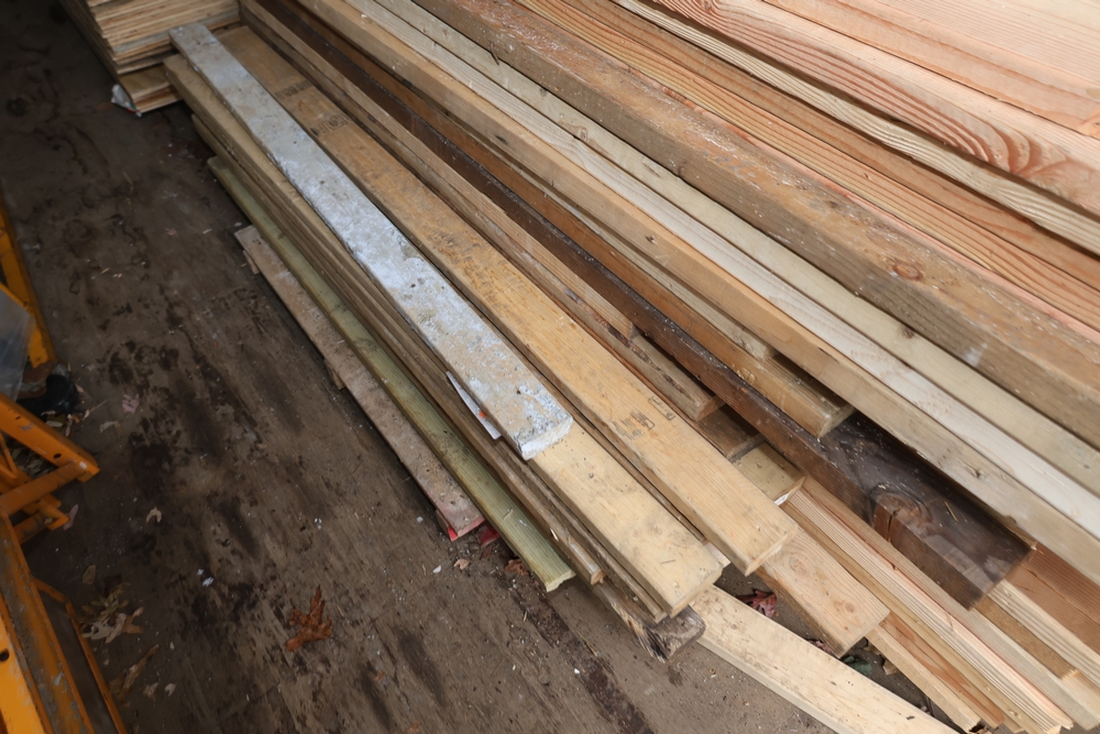 Assorted dimensional lumber including multiple 2 inch x 4 inch x 96 inch kiln dry boards labeled Irving, 2 inch x 4 inch x 10 foot boards labeled Weyerhaeuser, pressure treated 4 inch x 4 inch posts, and additional mixed length boards and planks stacked in a shipping container. Excludes other lots. Buyer must take all.