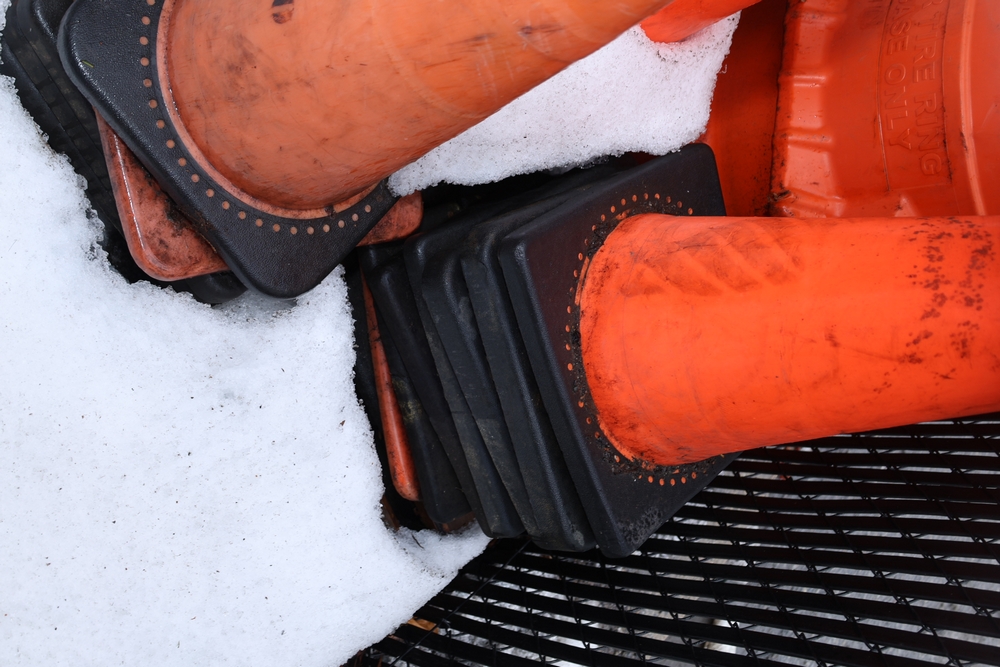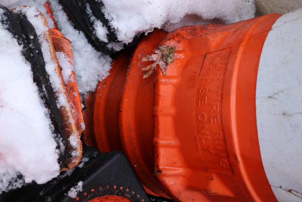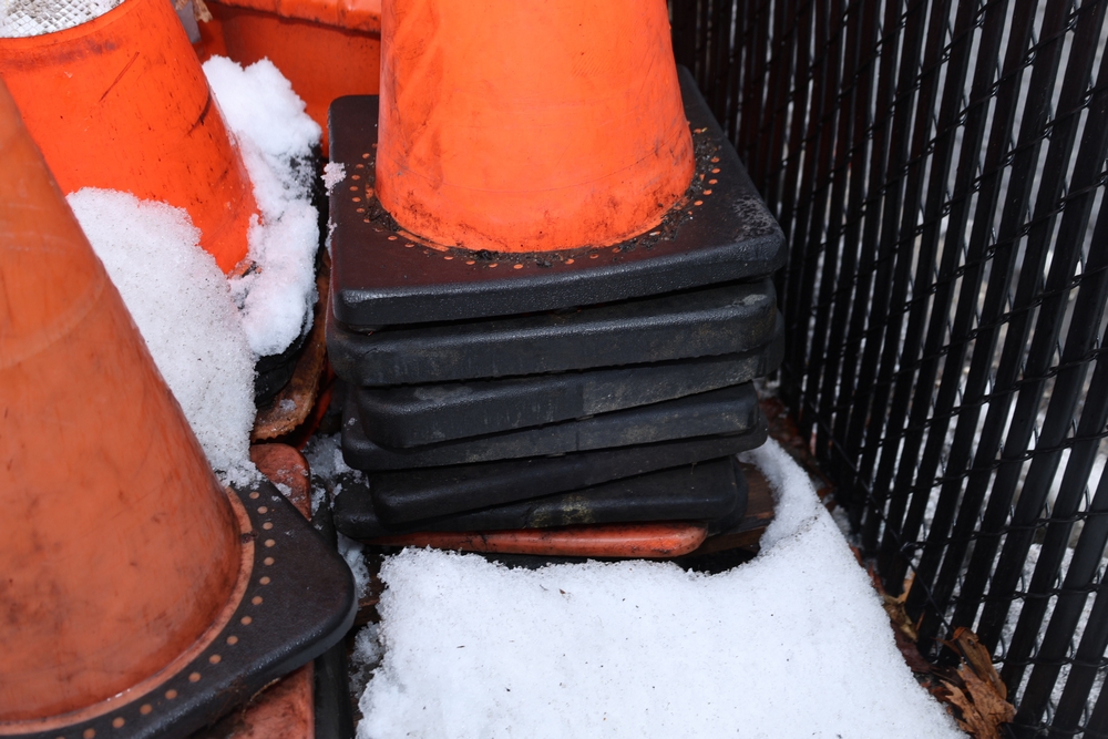 Assorted traffic control safety equipment including multiple reflective traffic cones with weighted rubber bases and one portable traffic barrel with carry handle and tire ring base.
