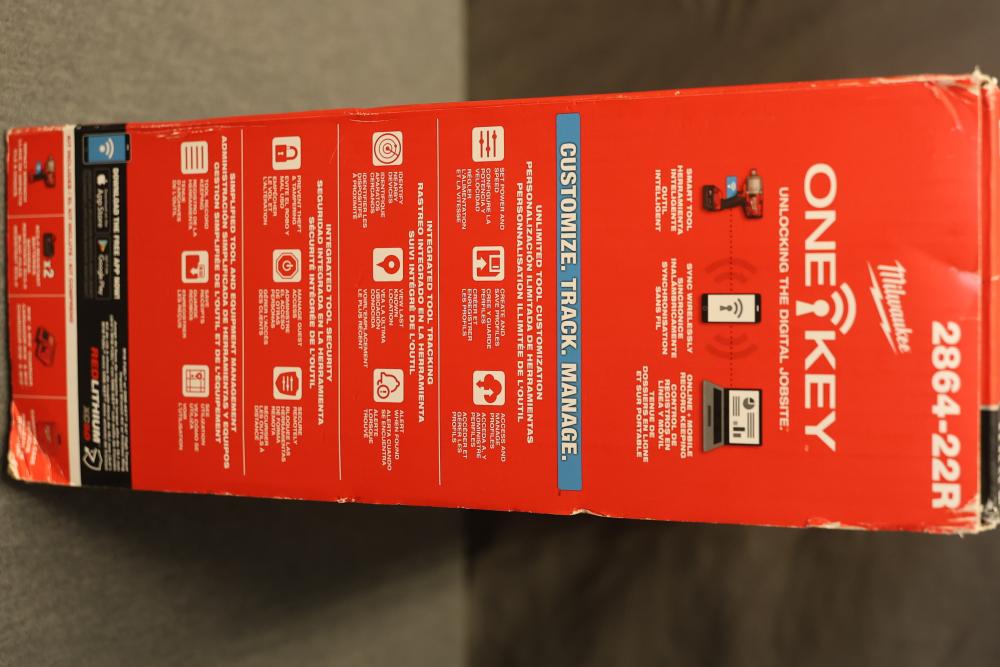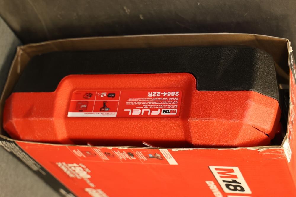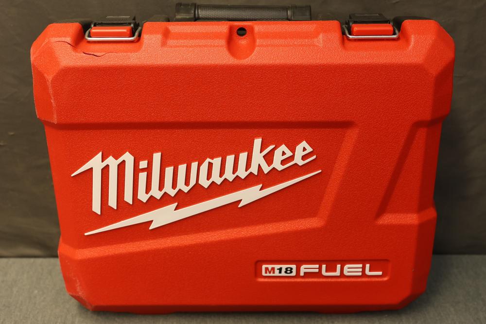 Milwaukee 2864-22R M18 Fuel One-Key Compatibility High Torque Impact Wrench with 3/4 Inch Friction Ring Kit. Includes the M18 Fuel impact wrench, charger, two RedLithium XC 5.0 batteries, and carrying case. Features 1500 ft-lbs of torque, One-Key technology for tool customization and tracking, and a compact design. The carrying case has a crack visible in the exterior. Pickup only.