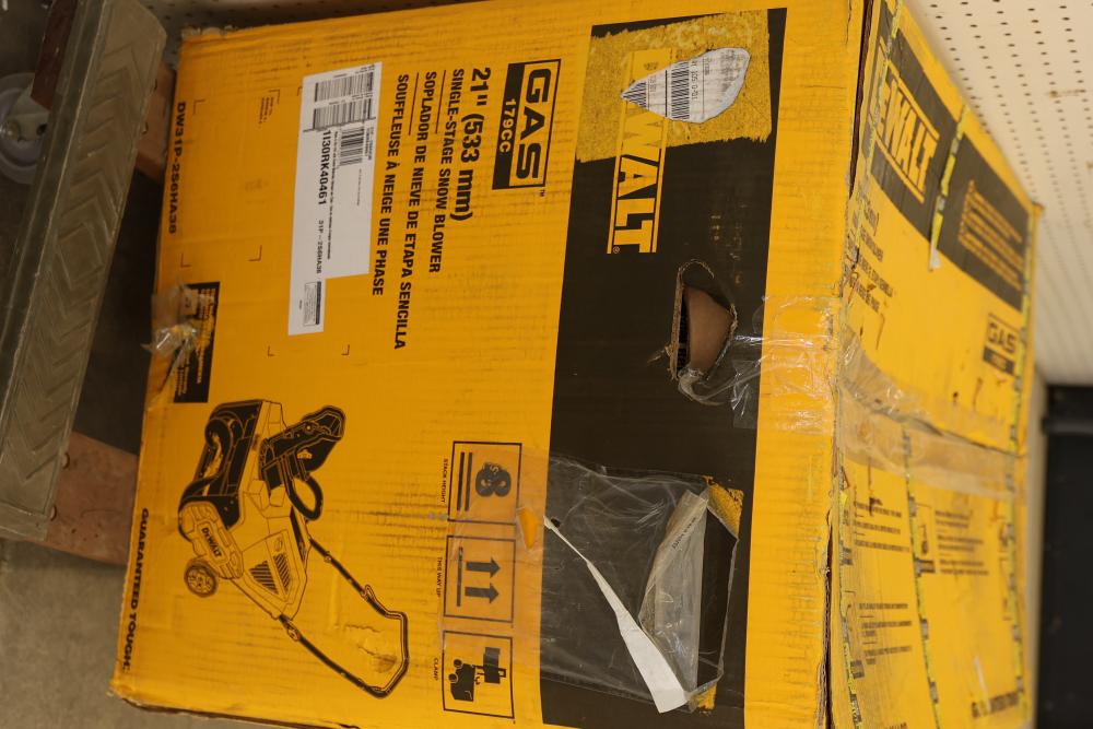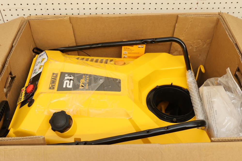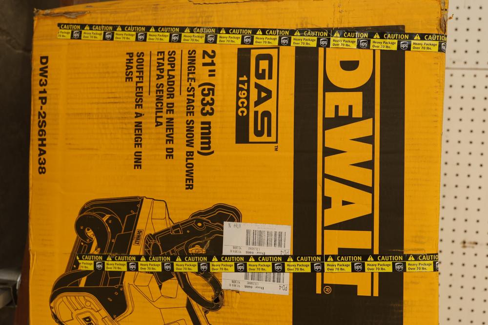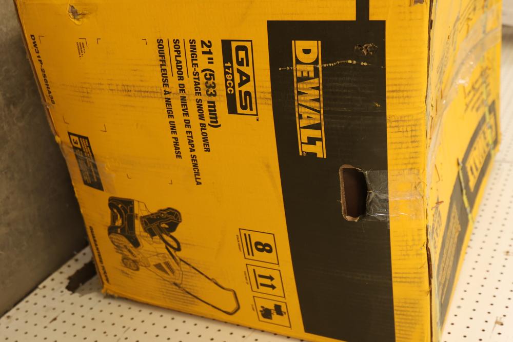 Dewalt 31P-2S6HA38 21 Inch 179 CC Single-Stage Gas Snow Blower. This gas-powered snow blower features a robust 179 CC engine and a 21-inch clearing width. It is designed as a single-stage machine for efficient snow removal. Item is new and comes in its original packaging with visible signs of shipping. Pickup only.