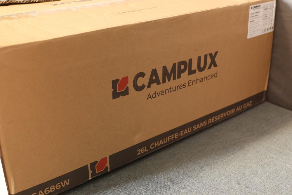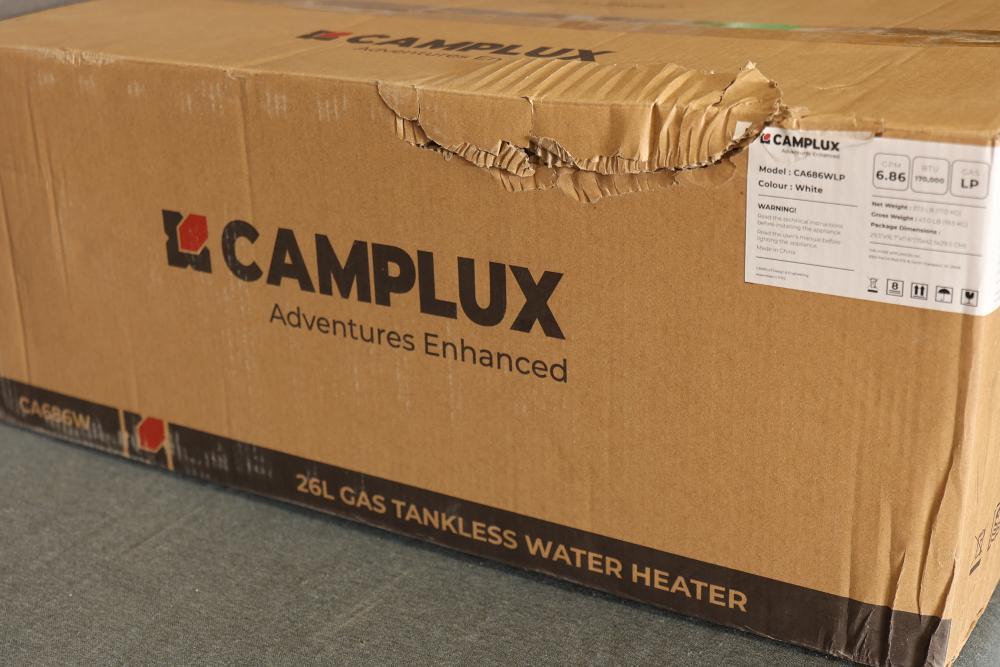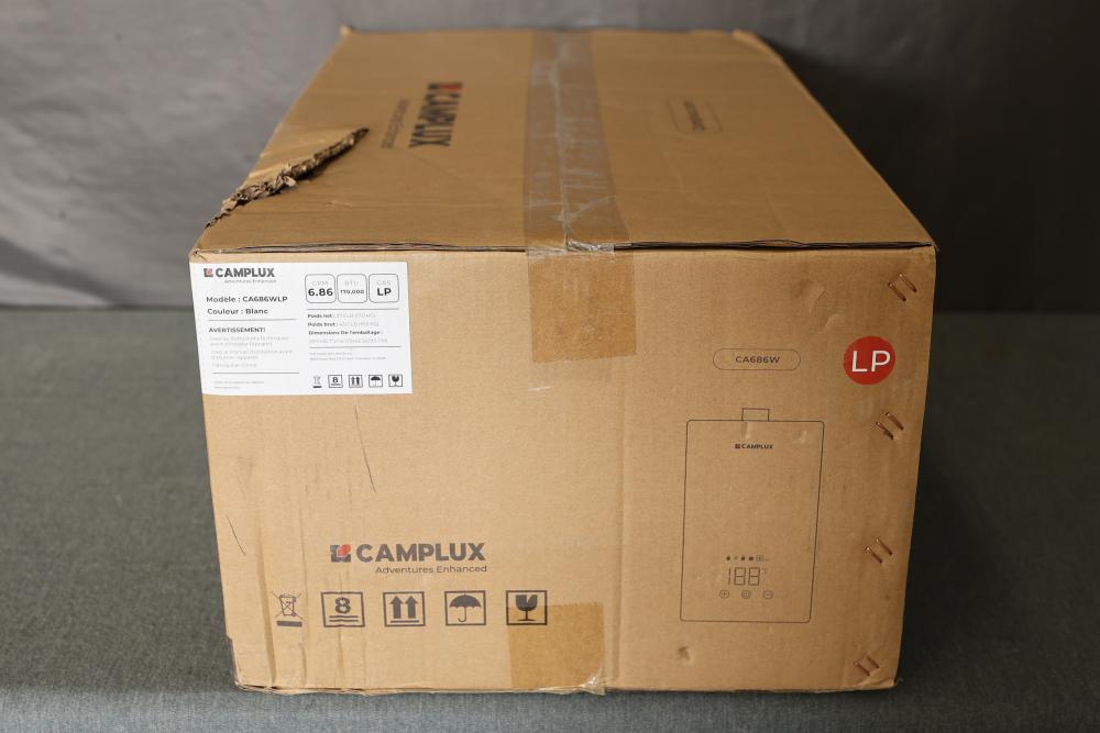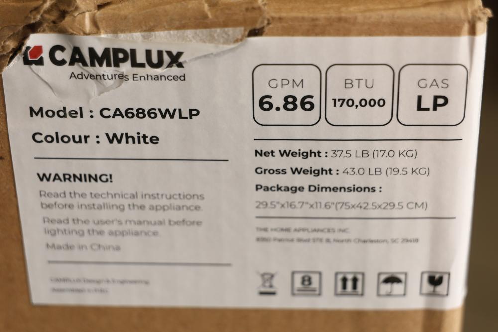 Camplux CA686WLP Climatech-7 26 Liter 6.86 GPM 170,000 BTU Index Propane Tankless Water Heater with LED Digital Display. Features a white design, LED digital display, and advanced propane functionality. Compact and efficient, it handles up to 6.86 gallons per minute and offers a heating capacity of 170,000 BTU. Net weight is 37.5 lbs, gross weight is 43 lbs, and overall dimensions are 25x16x7. Pickup only.